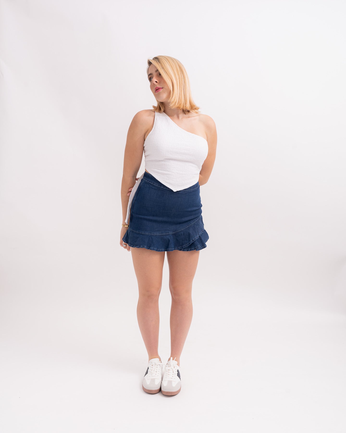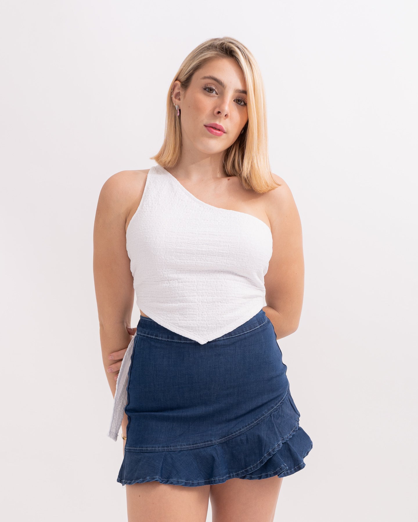 Blusa asimétrica con tirante regulable y amarre en posterior.