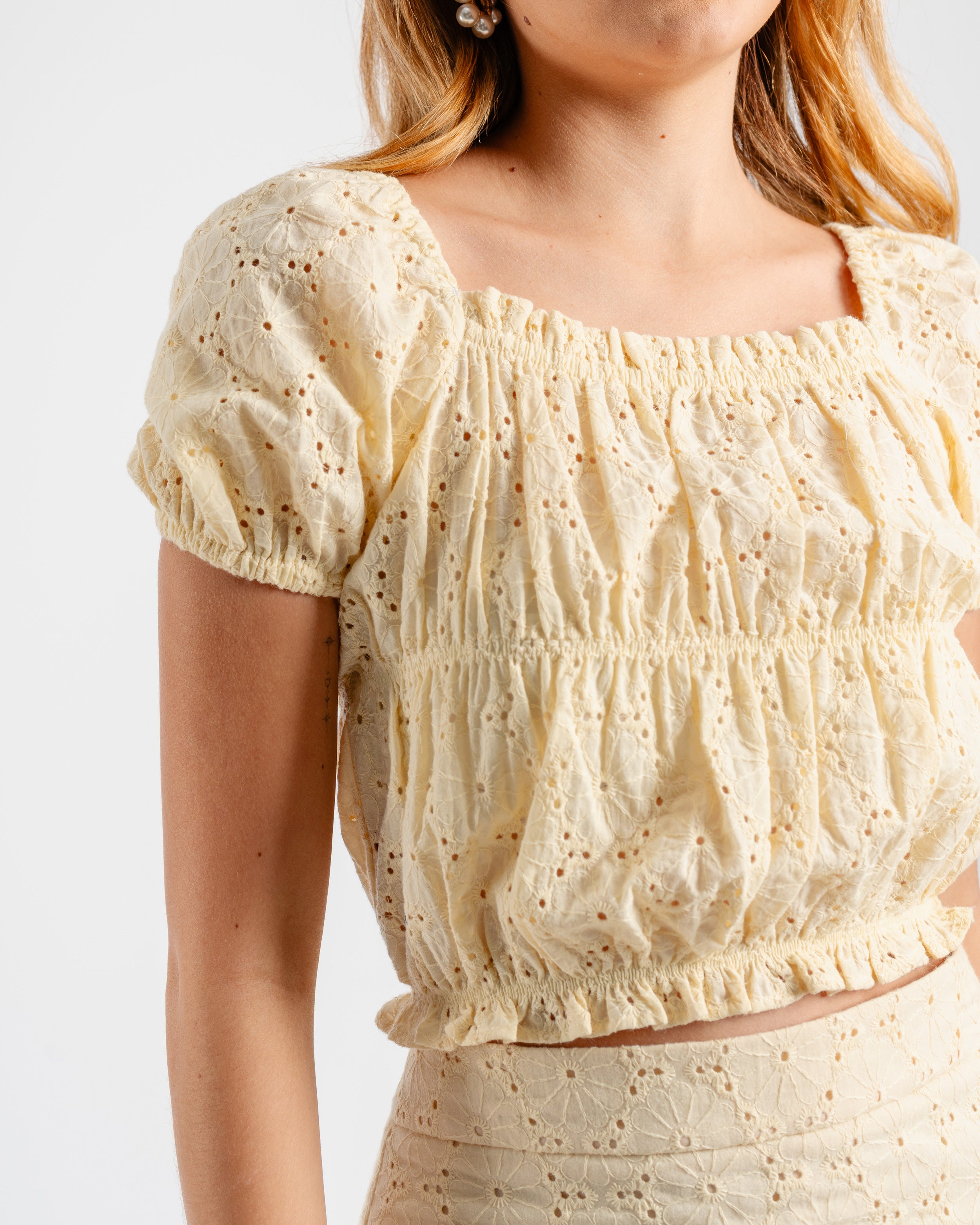 Blusa de algodón bordado con elásticos en puños, contornos de pecho y cintura