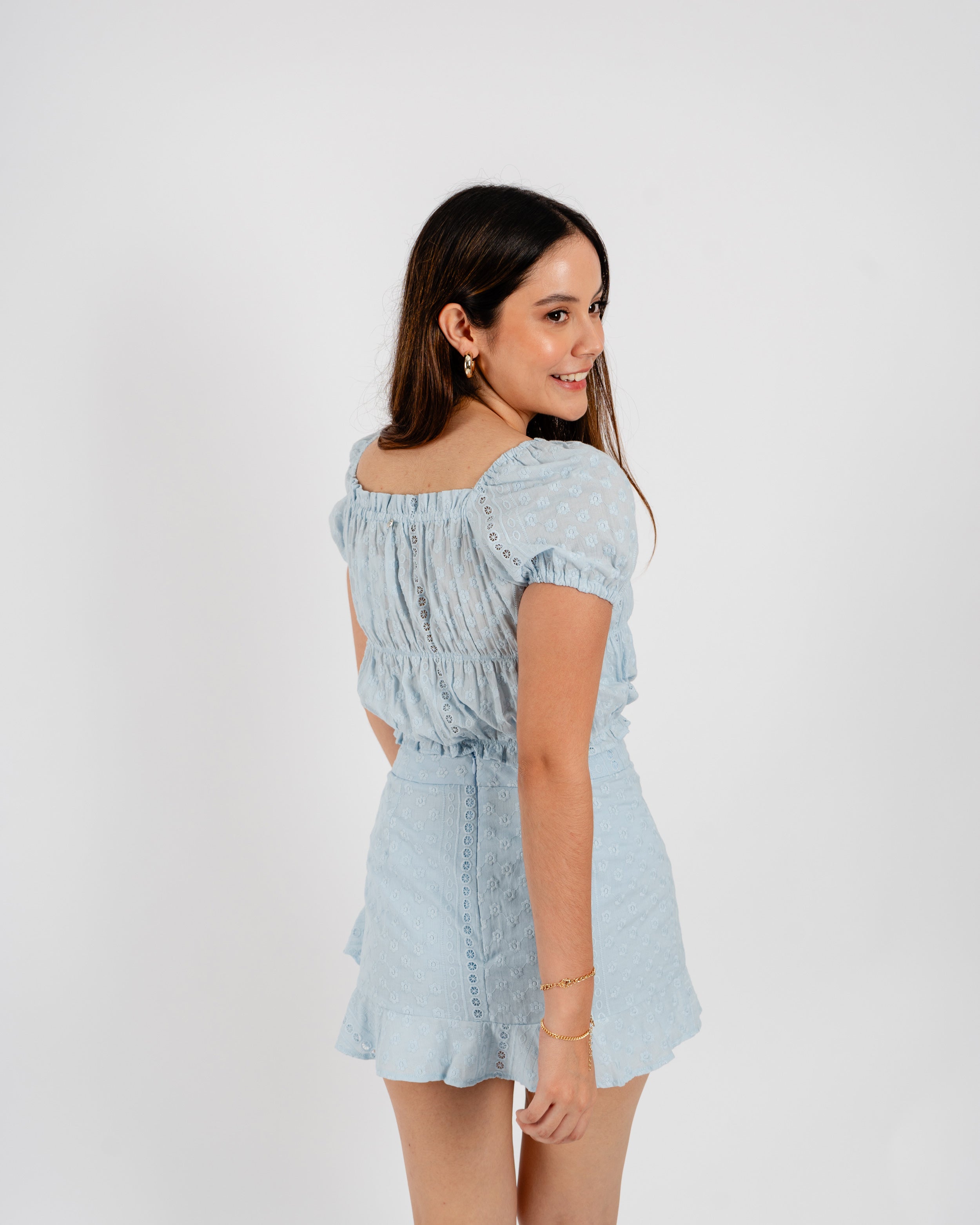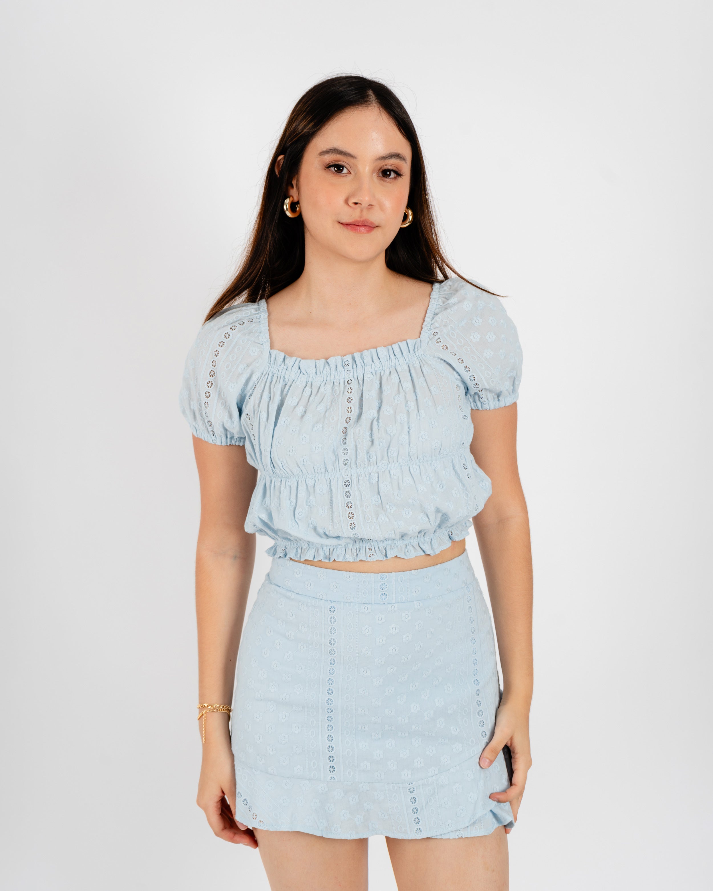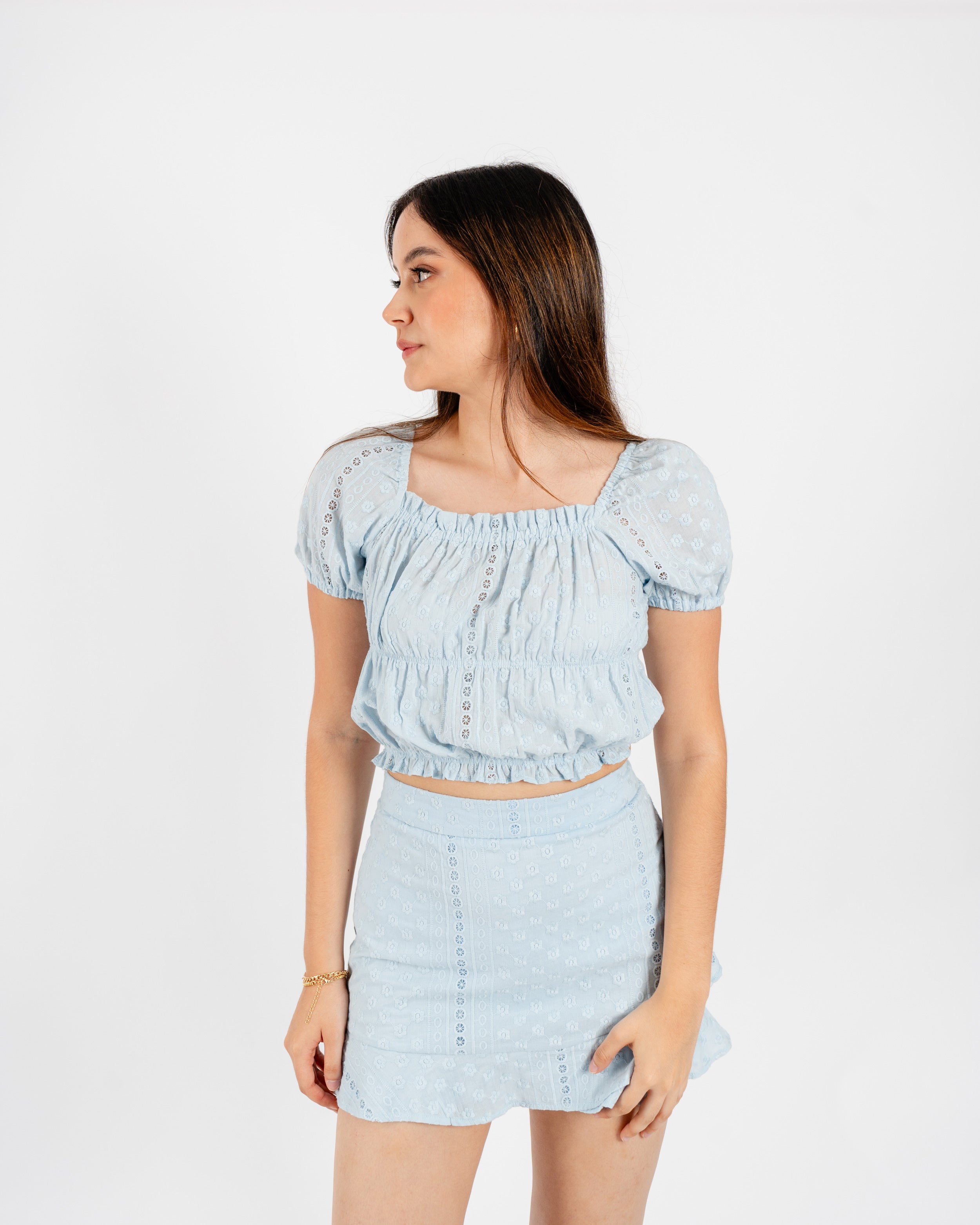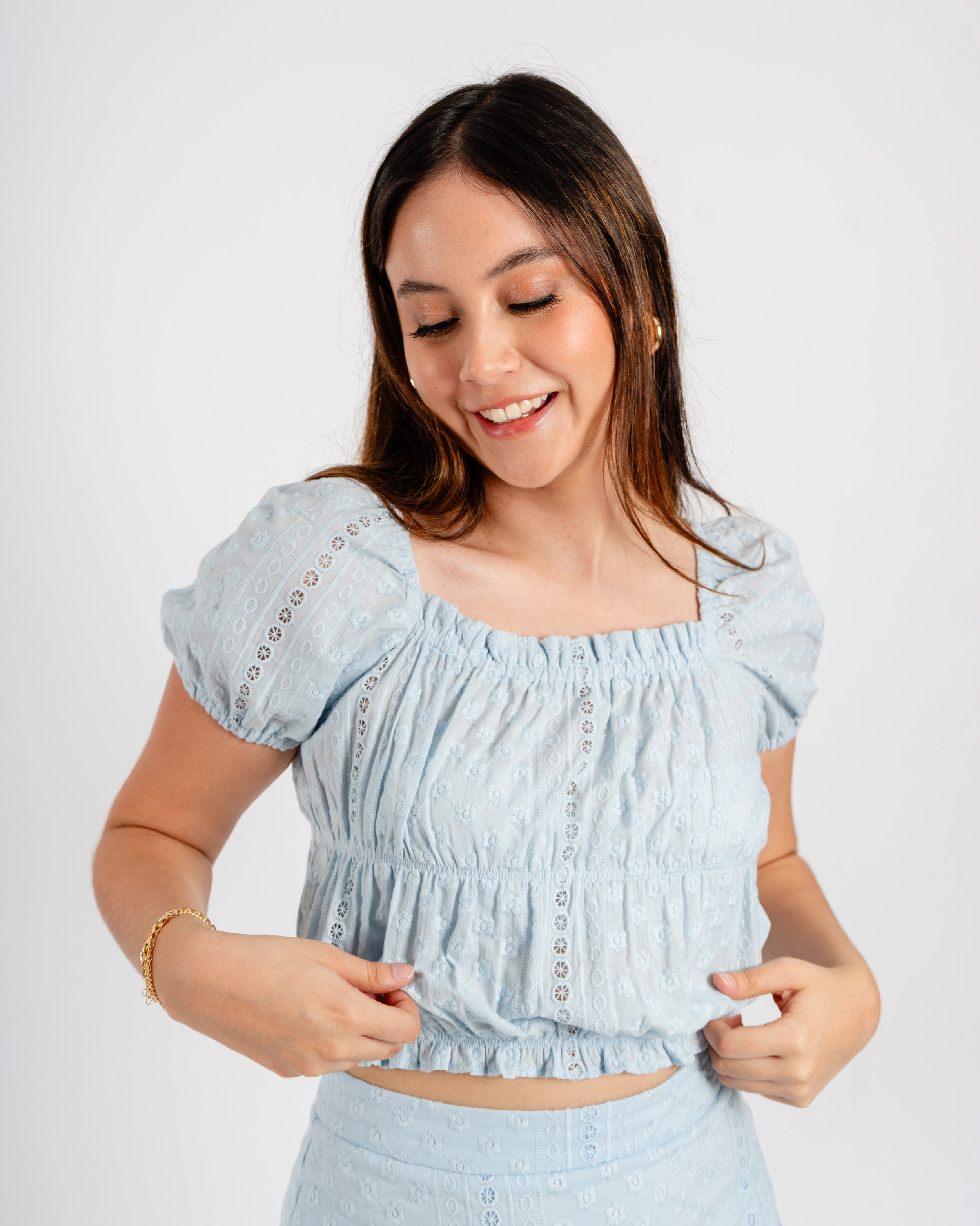 Blusa de algodón bordado con elásticos en puños, contornos de pecho y cintura