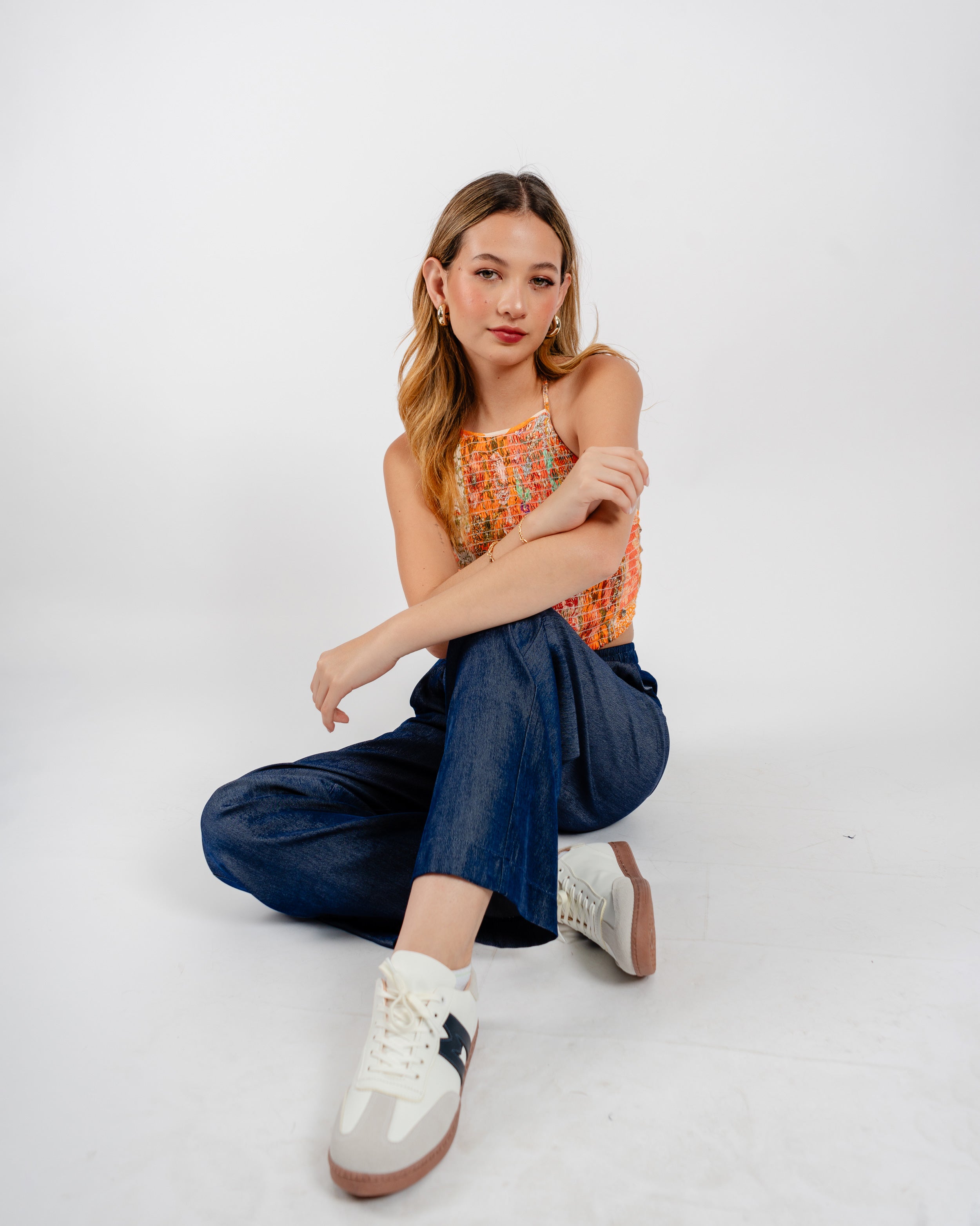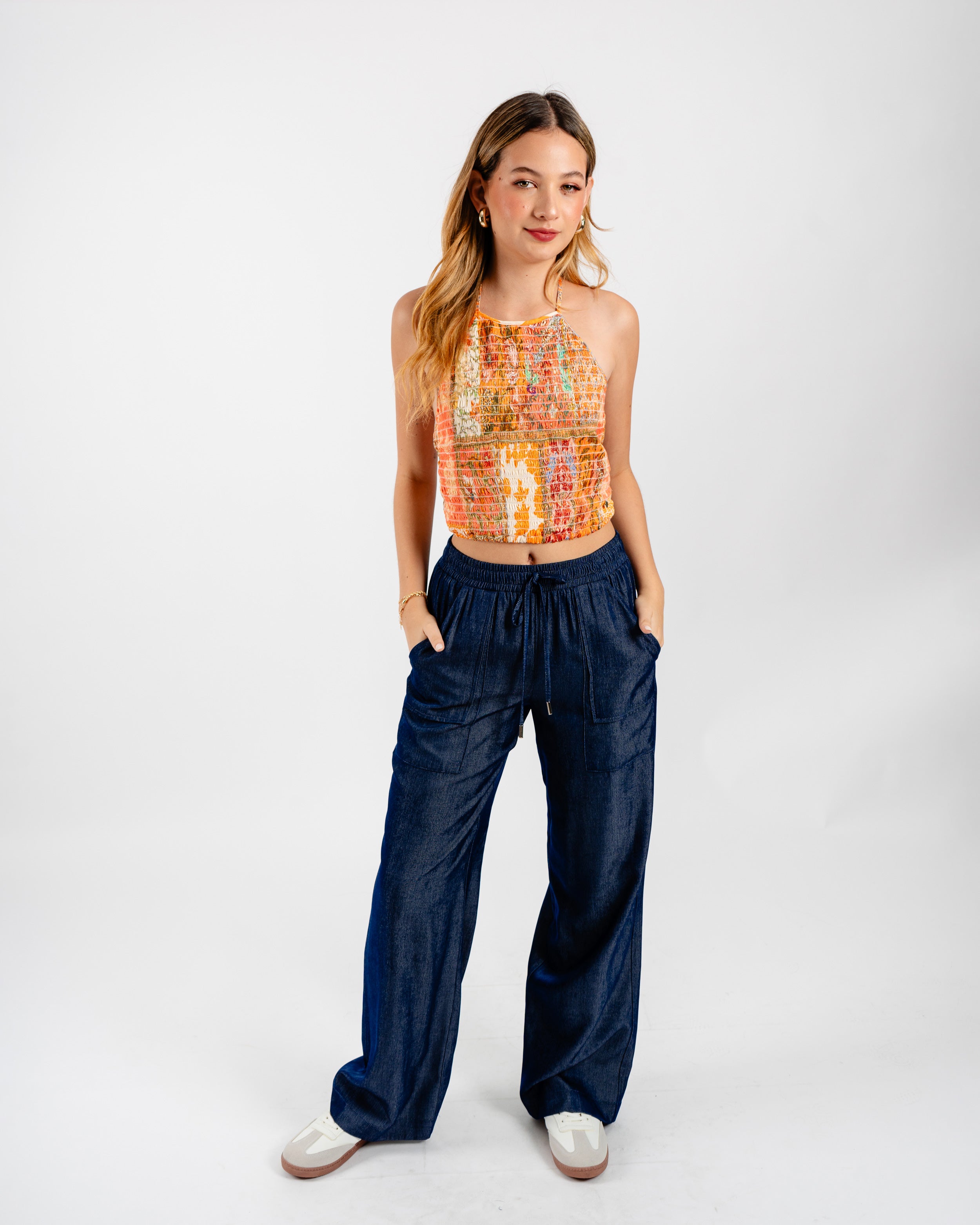 Blusa halter con nido de abeja completo y amarre en cintura posterior.