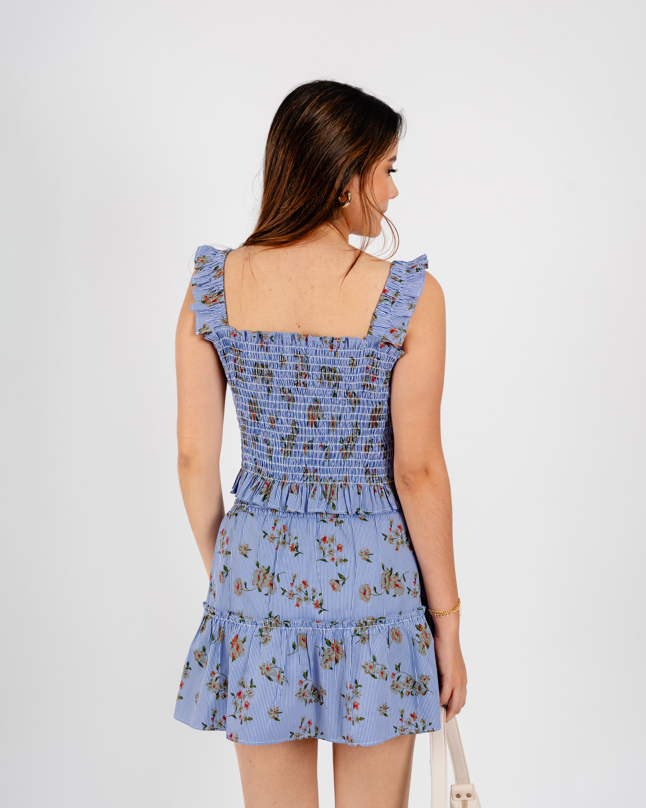 Blusa con nido de abeja en contorno con arandel pequeño en cintura, tirantes con elástico pasado y vuelo.