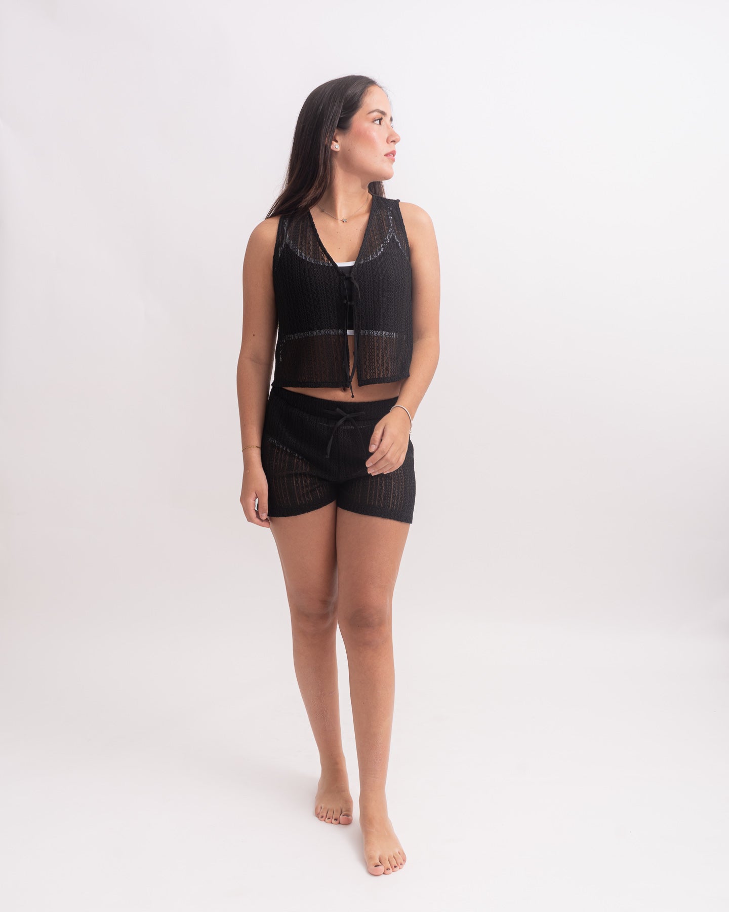Blusa manga sisa, escote en V con tiras de amarre en escote delantero.
