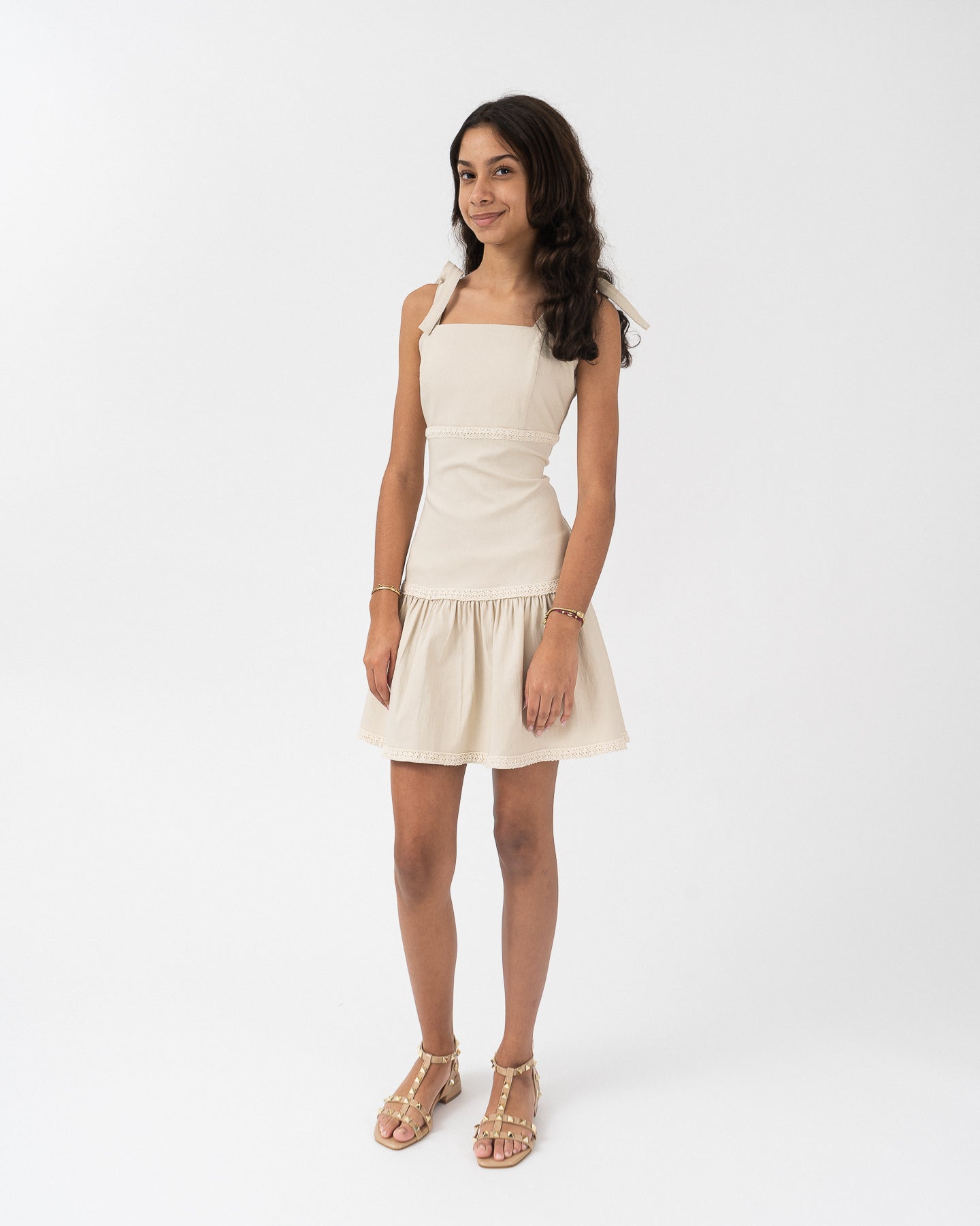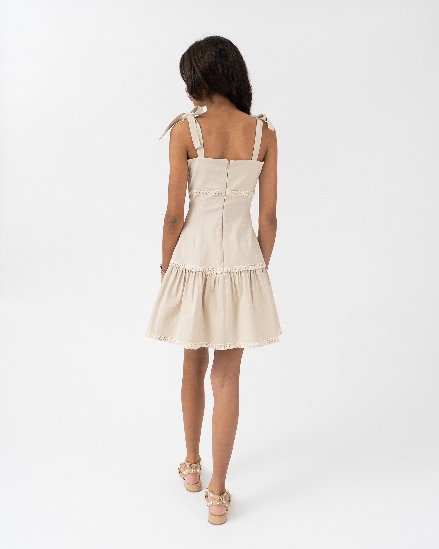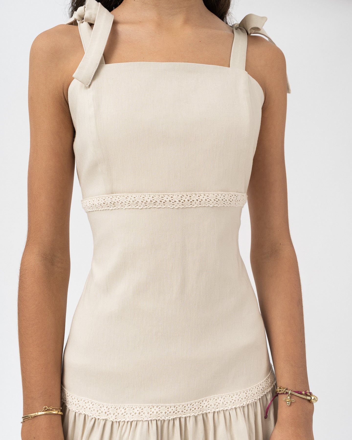 Vestido de tiras con detalle de guipur en bajo busto y cadera. Cierre invisible en centro posterior.