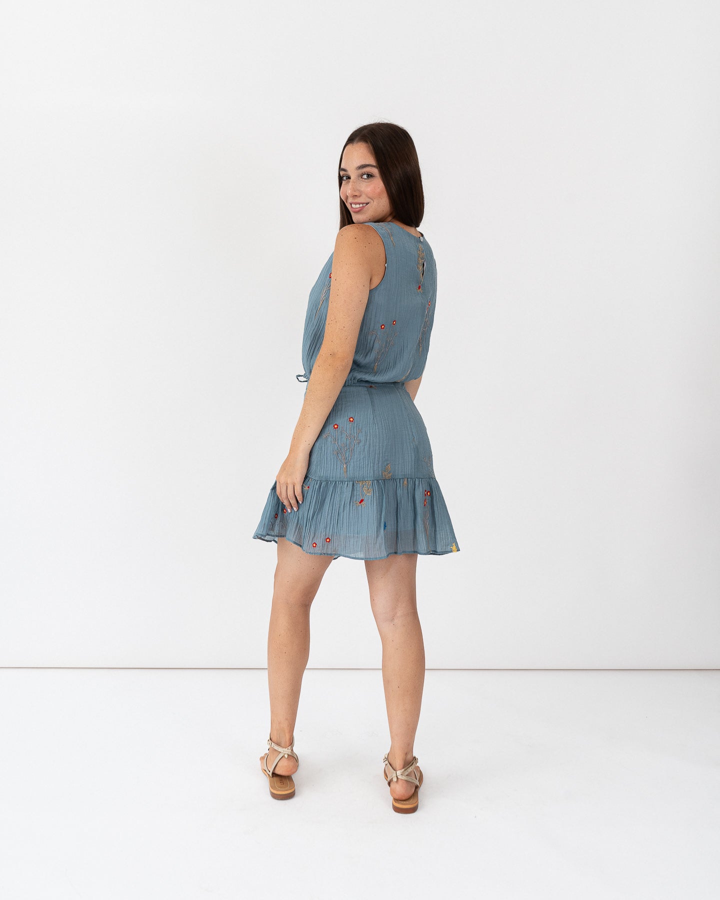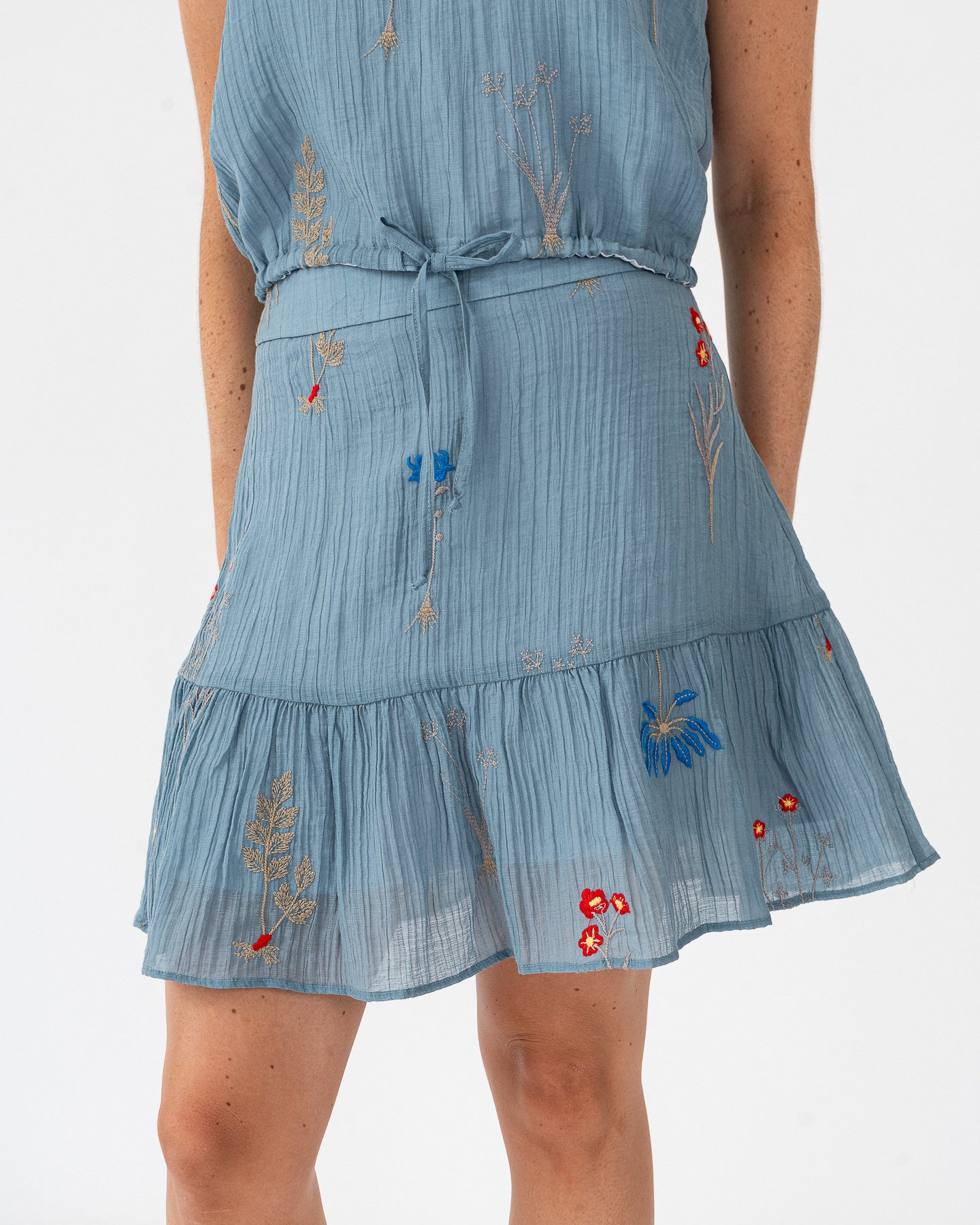 Falda forrada con pretina y vuelo recogido en contorno. Cierre invisible en centro posterior.