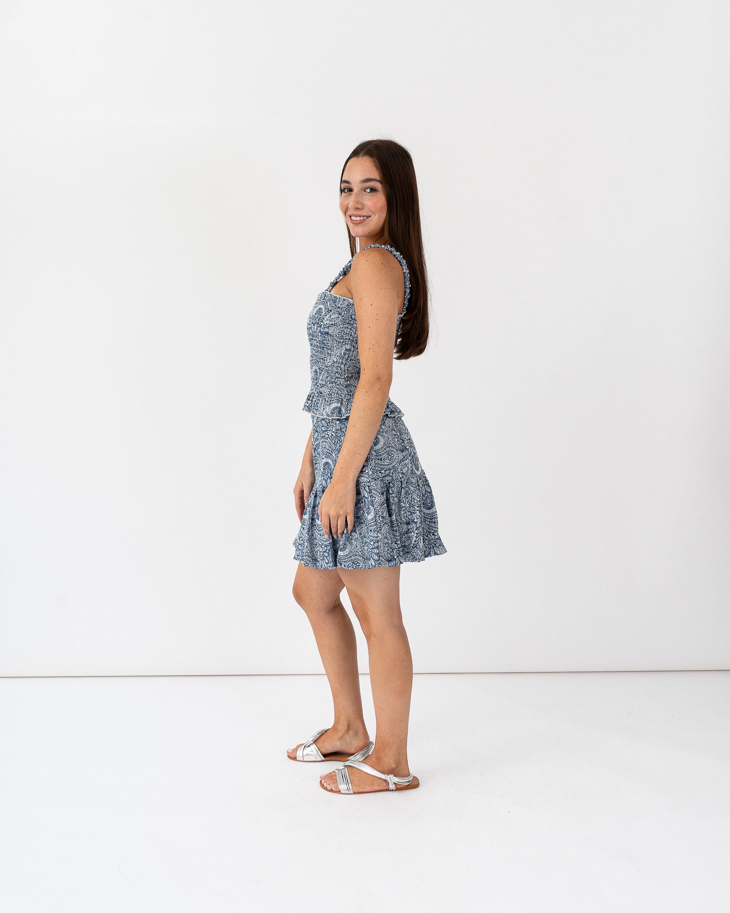 Falda forrada con pretina y corte canesú, ruedo tipo globo con recogidos.