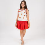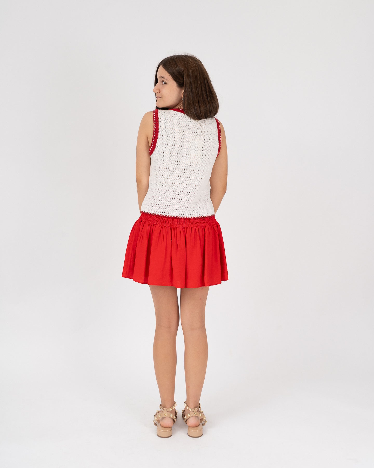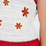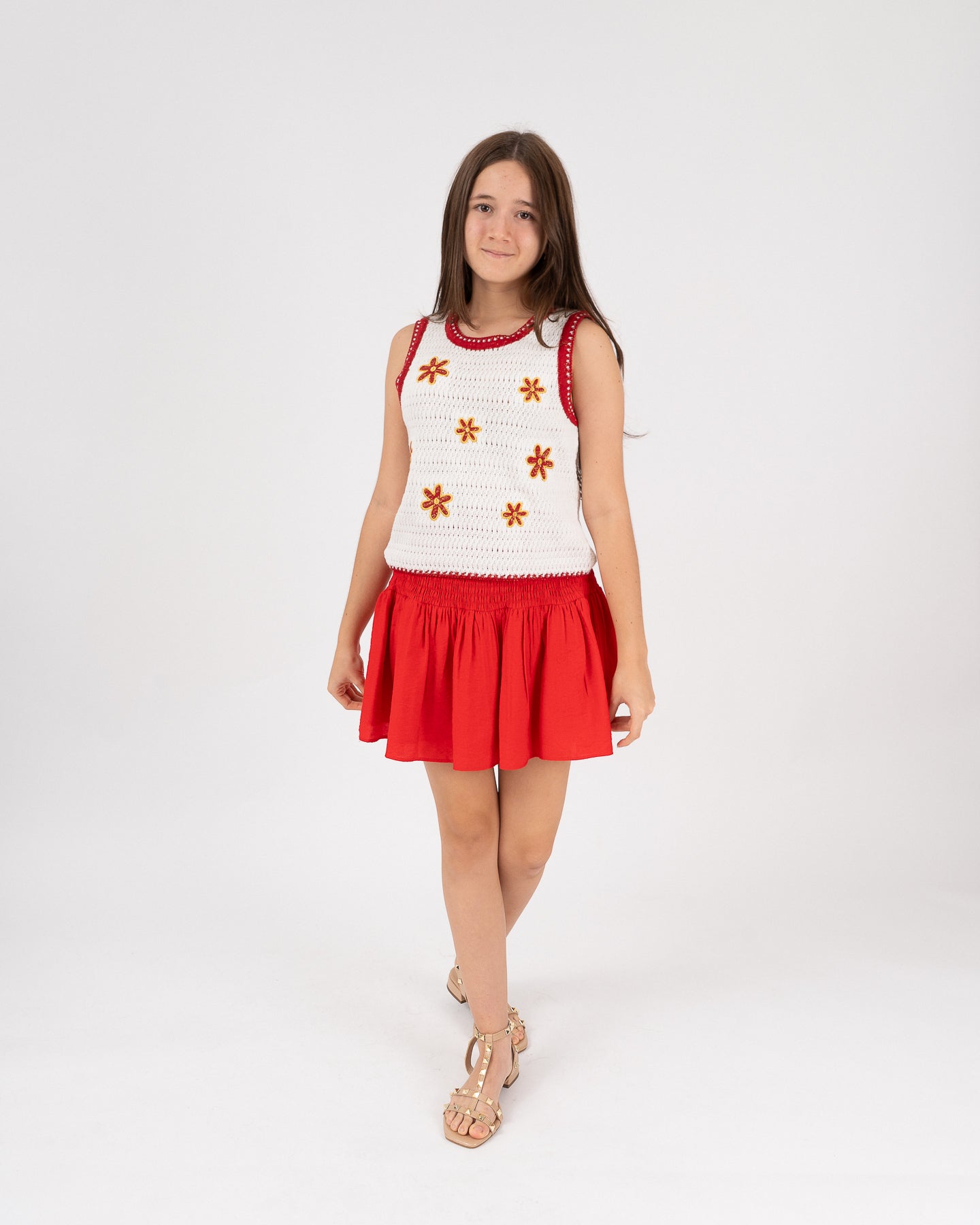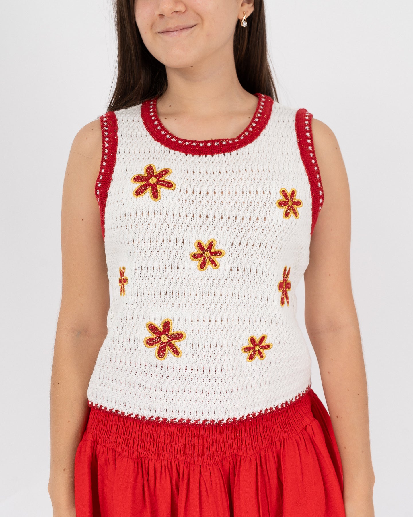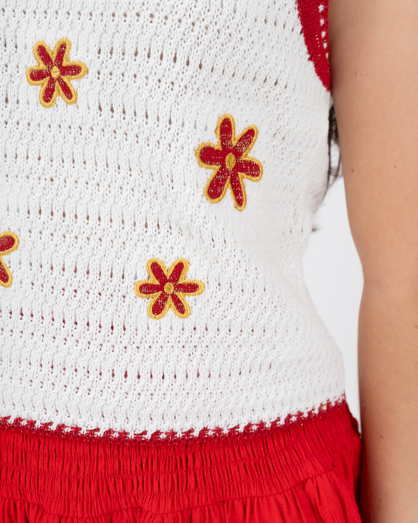 Blusa tejida manga sisa con filos de cuello, sisa y ruedo en contraste con 7 florcitas bordadas
