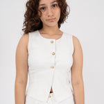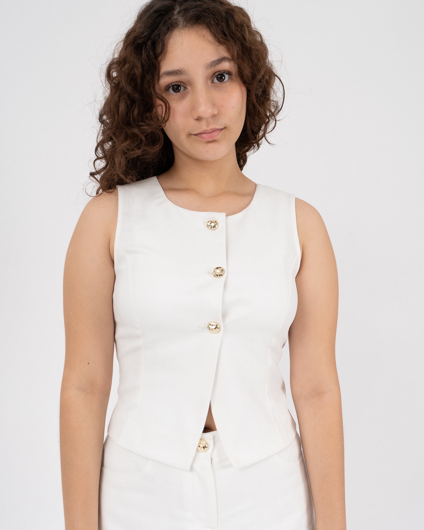 Chaleco escote redondo, cierre frontal con botones dorados.