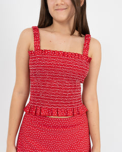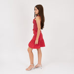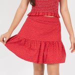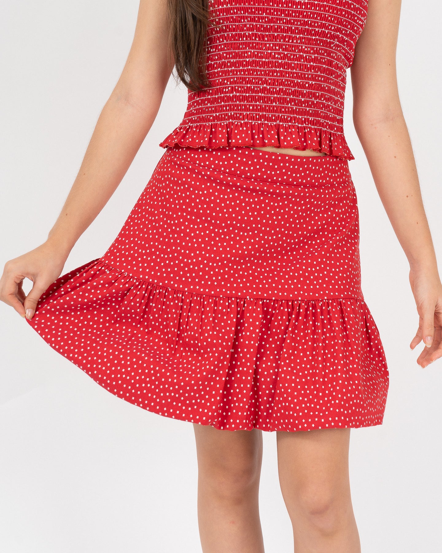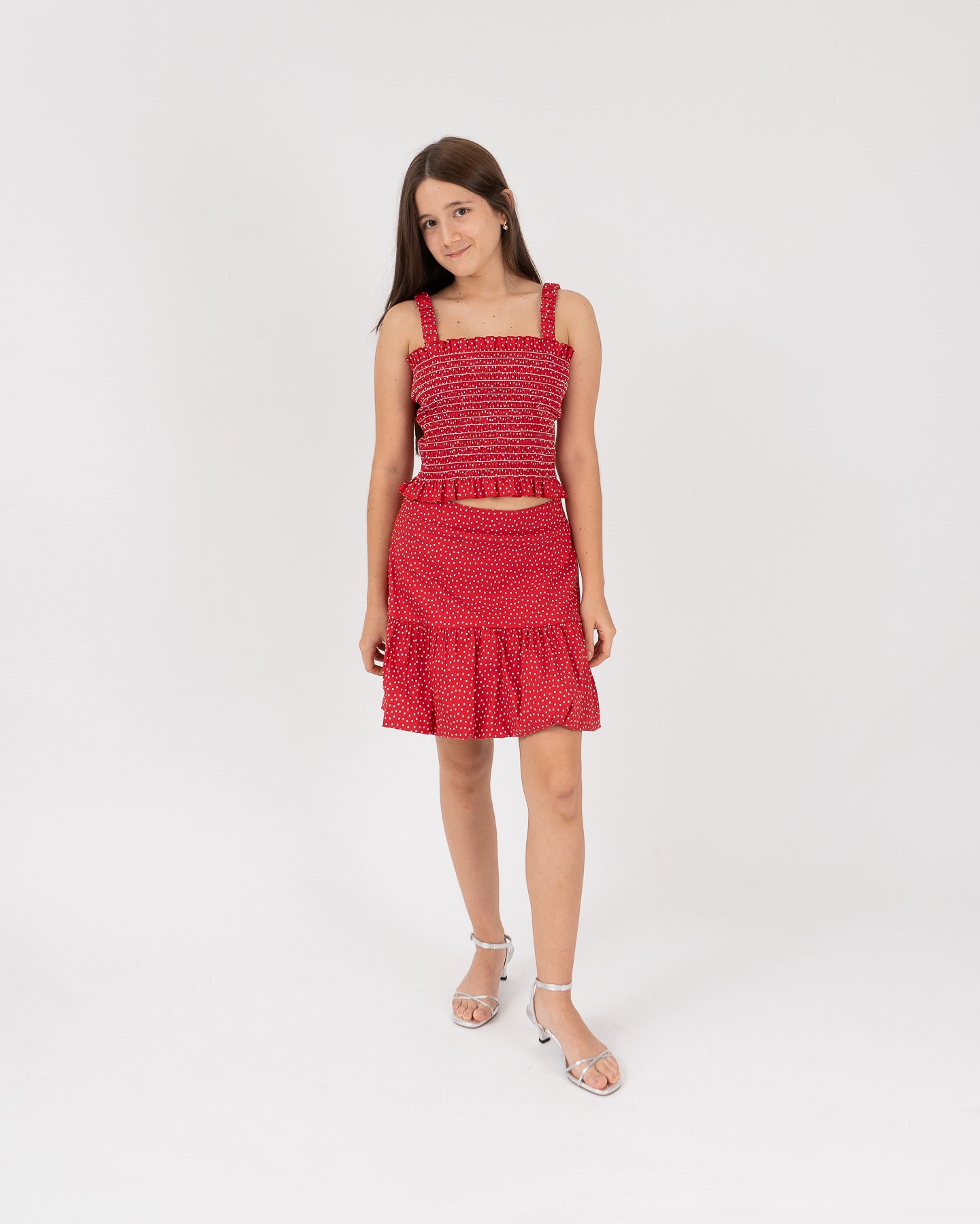 Falda forrada con pretina y corte canesú, ruedo tipo globo con recogidos.