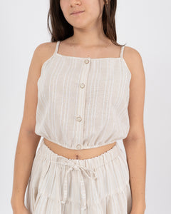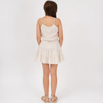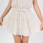 Falda con short interno, elástico pasado en contorno de cintura con 3 capas de vuelos recogidos, tira de amarre decorativa en centro de pretina delantera.
