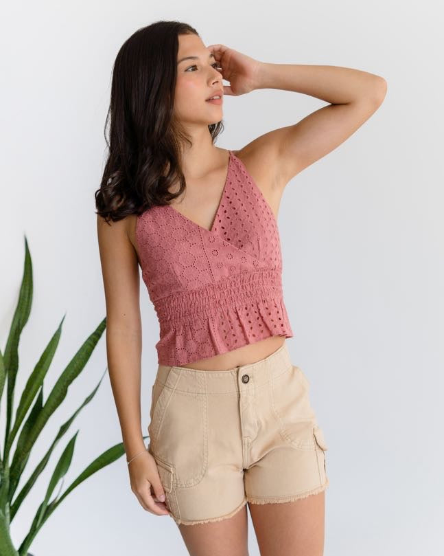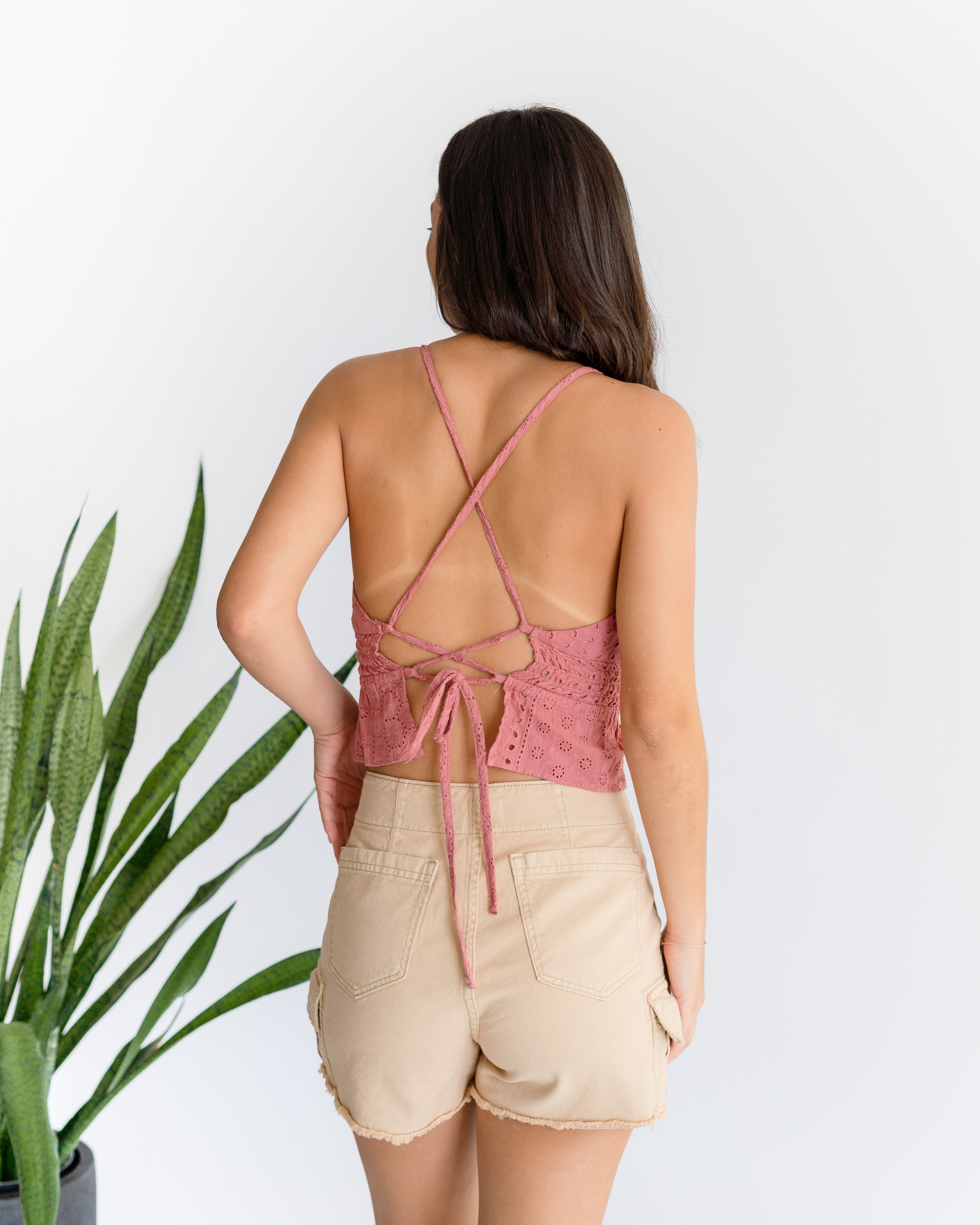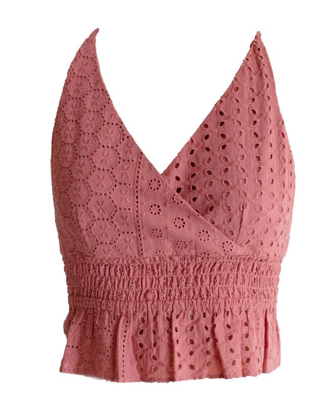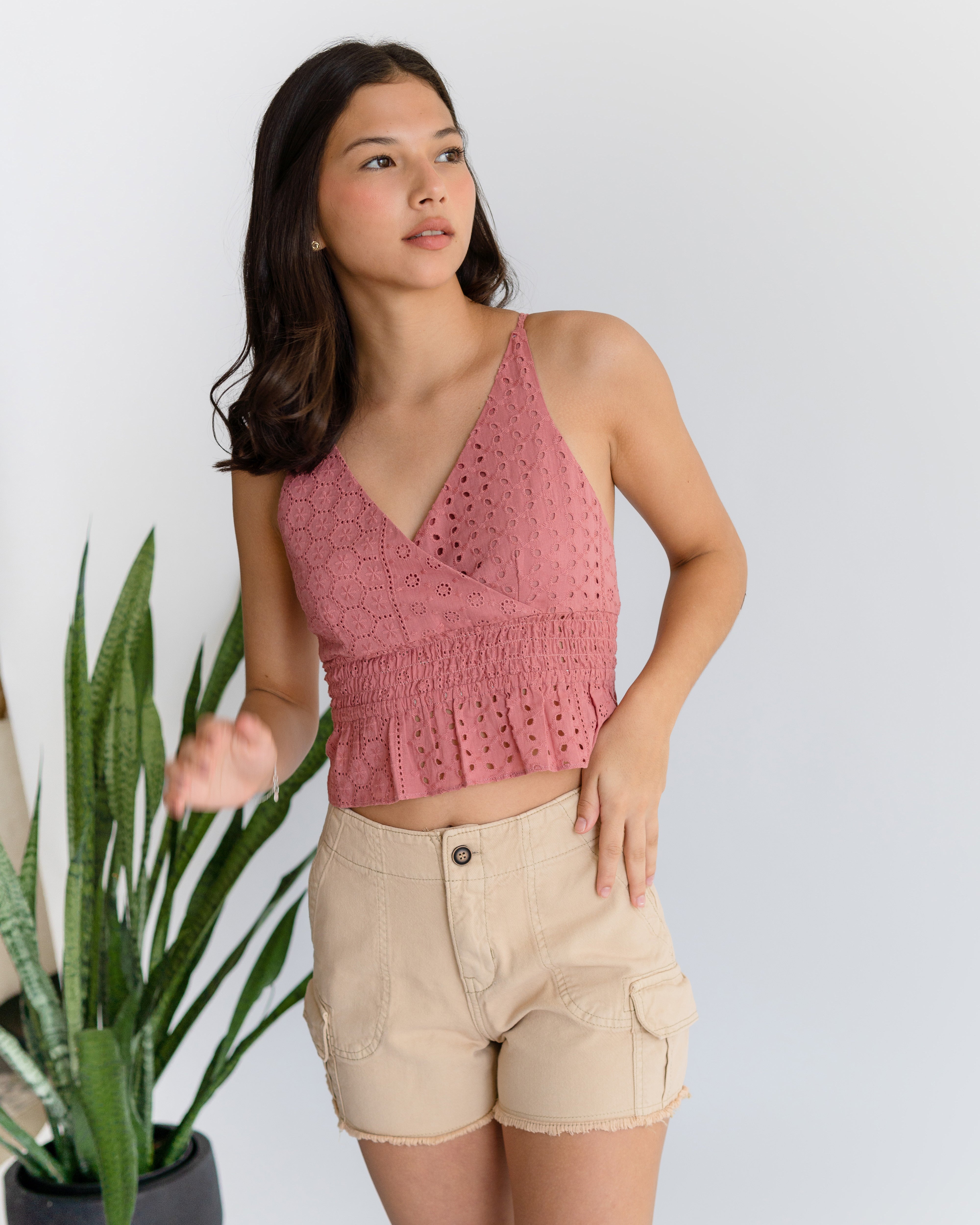 Blusa cruzada combinada con elástico en cintura, tiras cruzadas en espalda