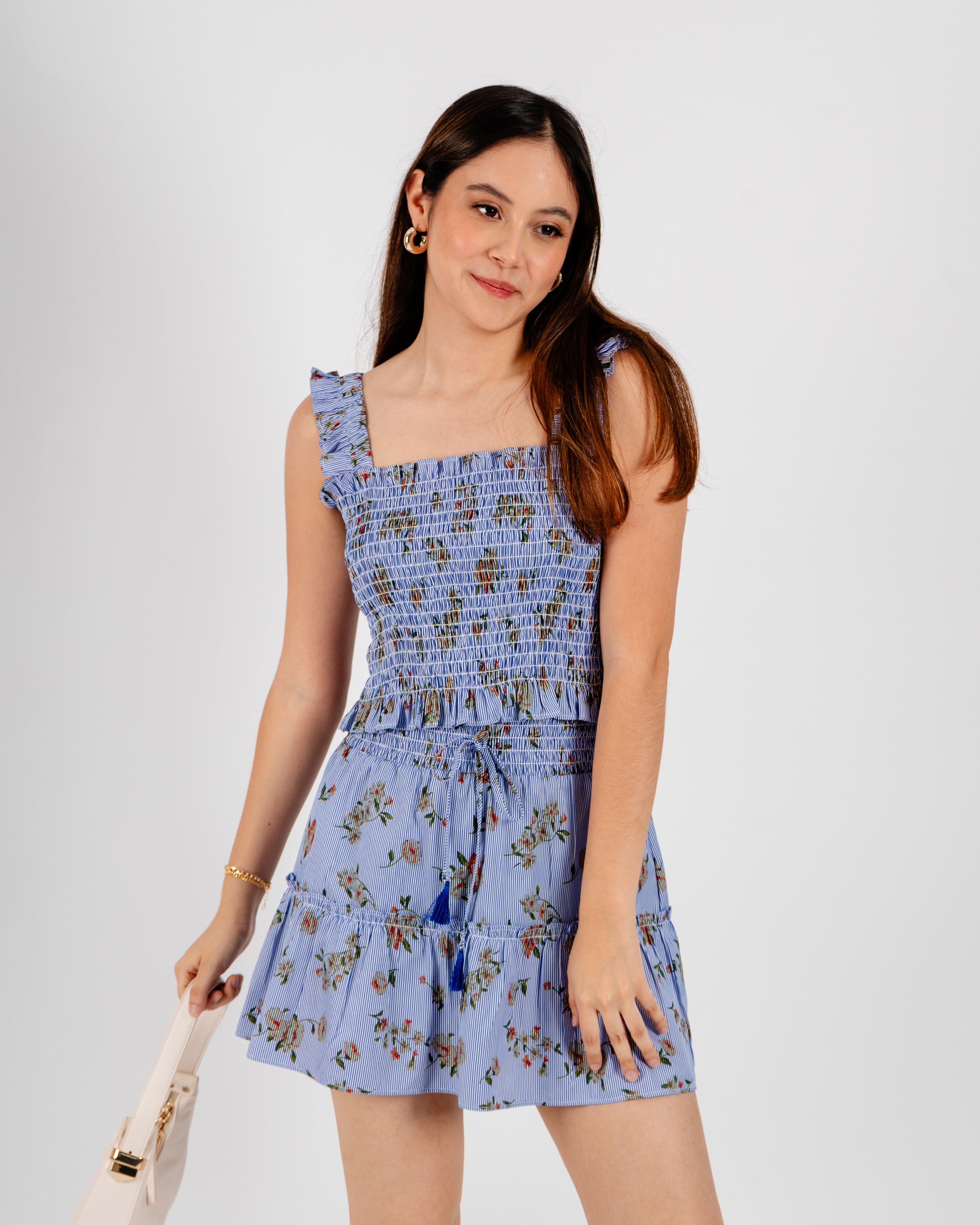 Falda con nido de abeja en contorno de cintura, tira de amarre con borlas decorativas y vuelo con arandel en ruedo.