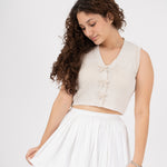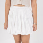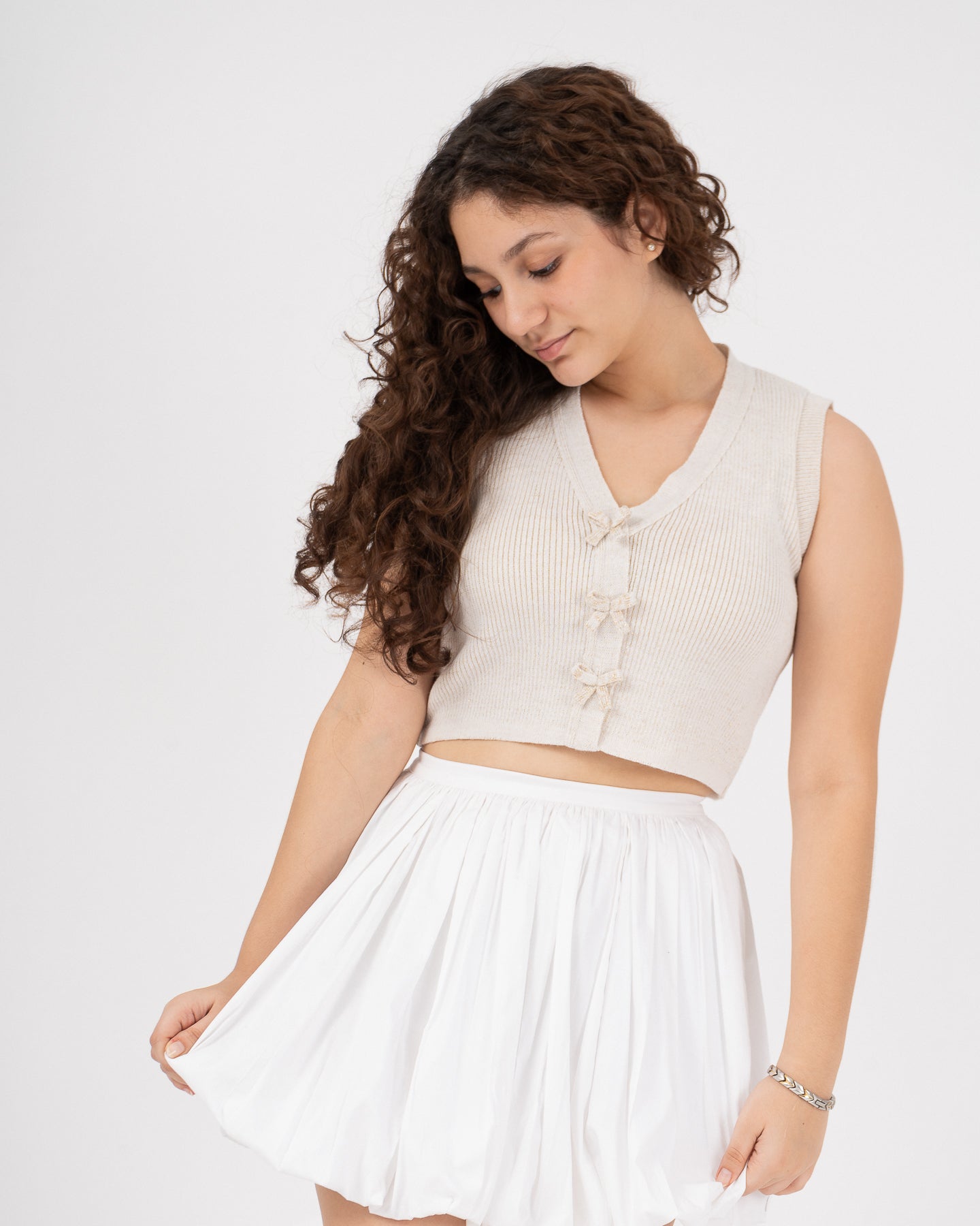 Falda globo forrada con bolsillos funcionales, cierre invisible en centro posterior.