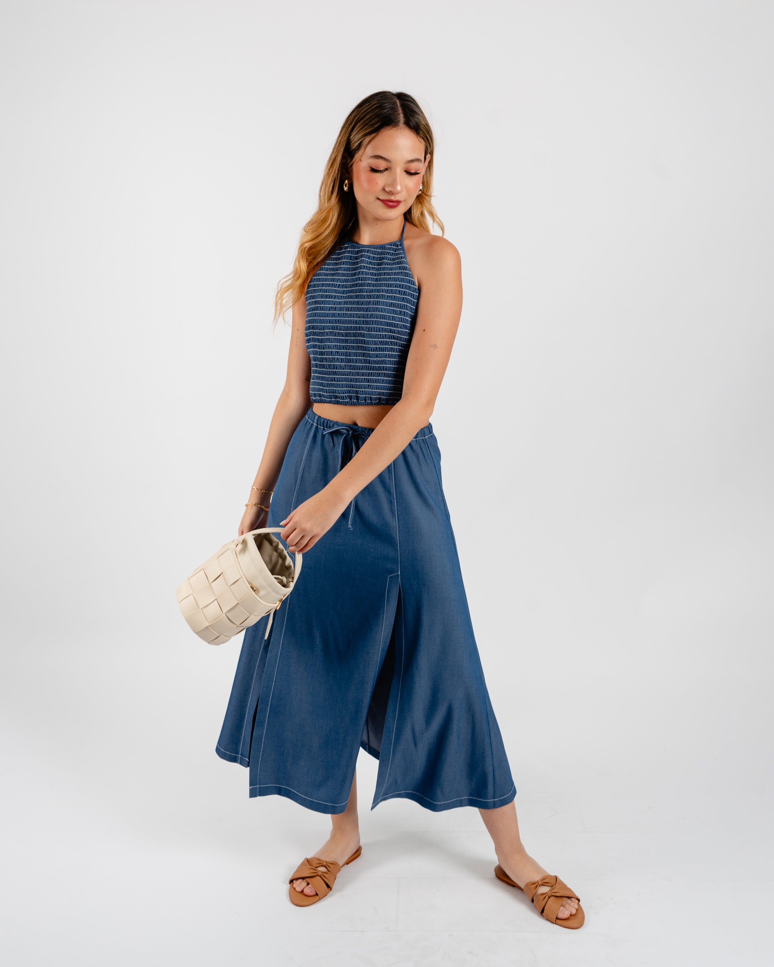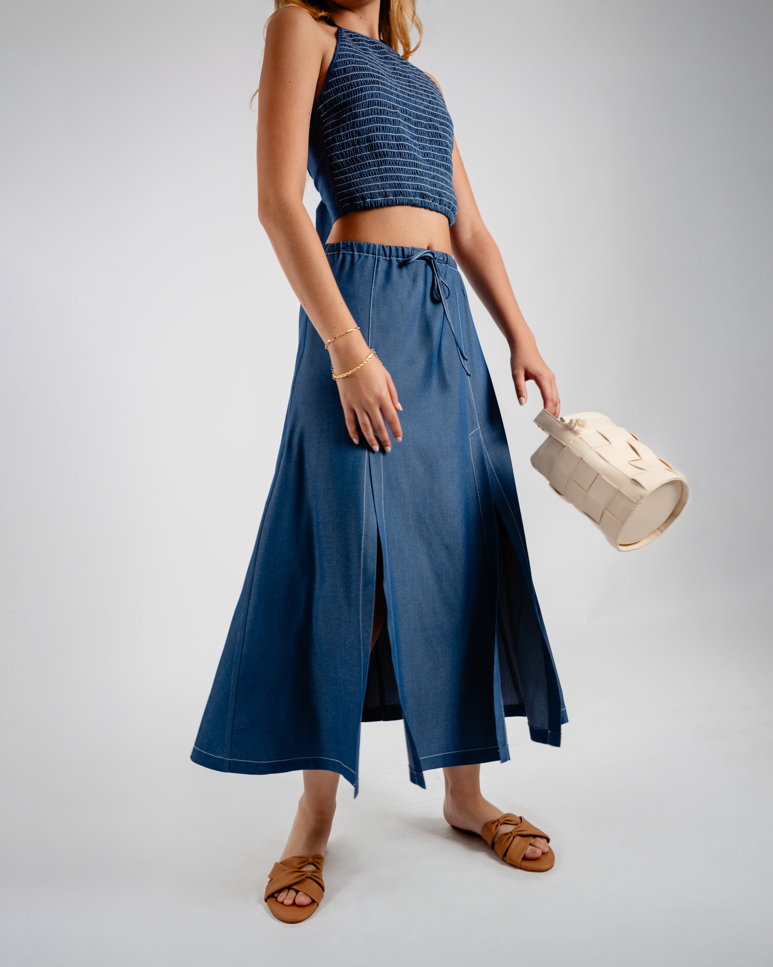 Falda larga con elástico en cintura y tira de amarre aberturas delanteras con hilos en contraste