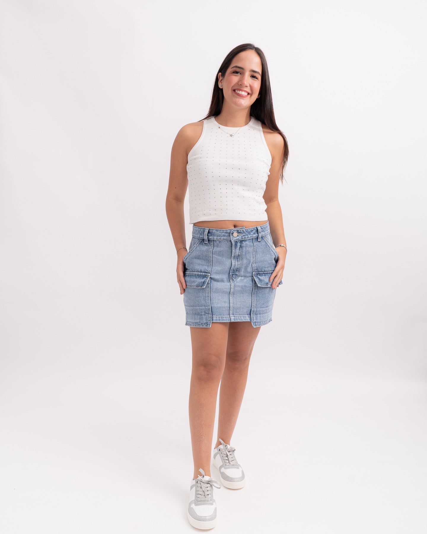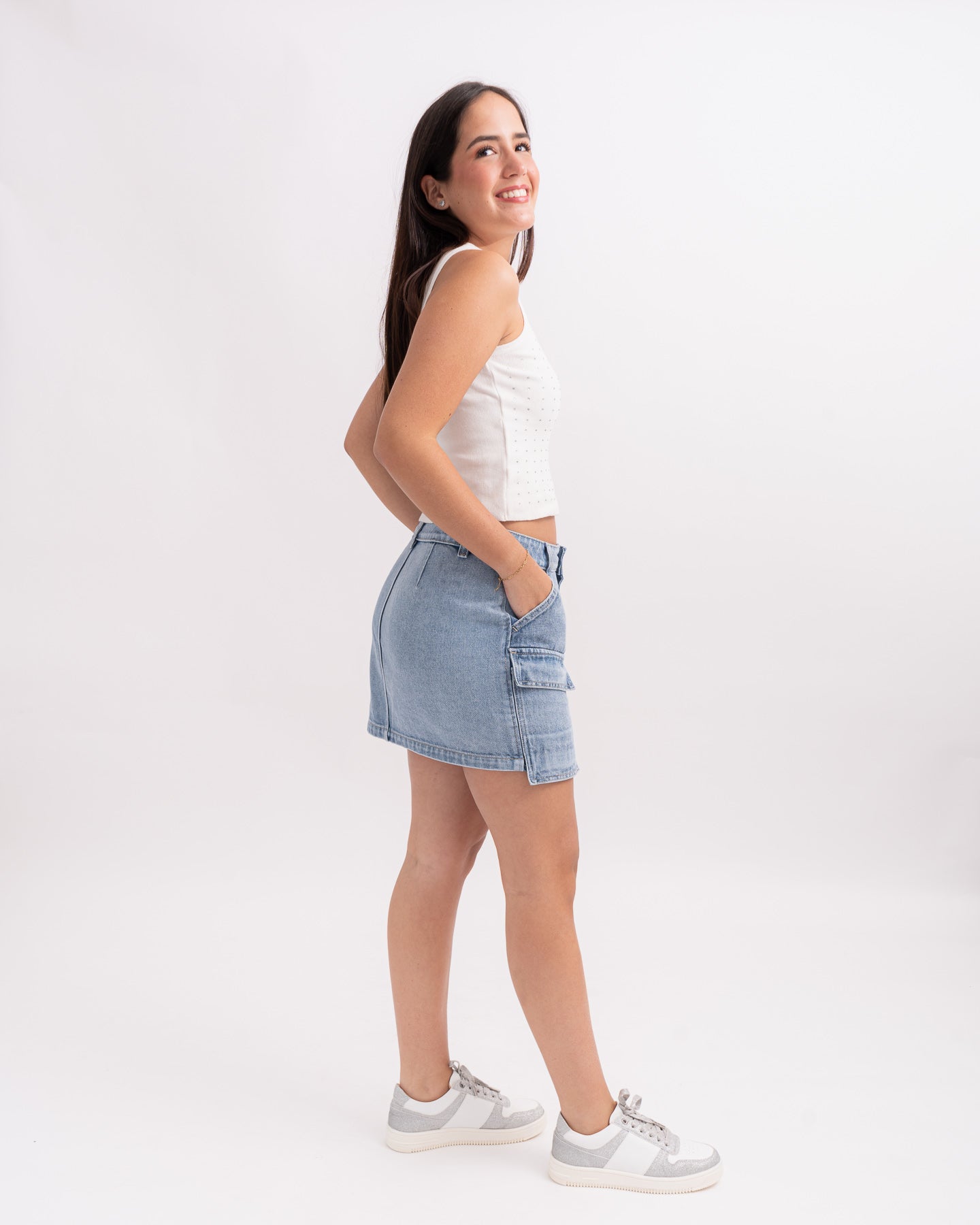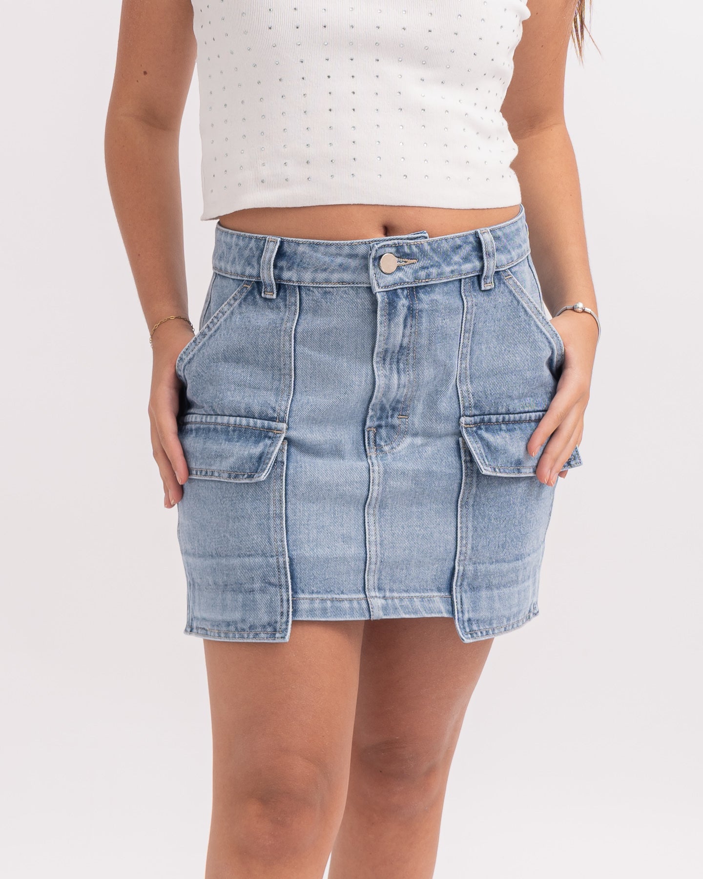 Falda corta denim con bolsillos grandes.