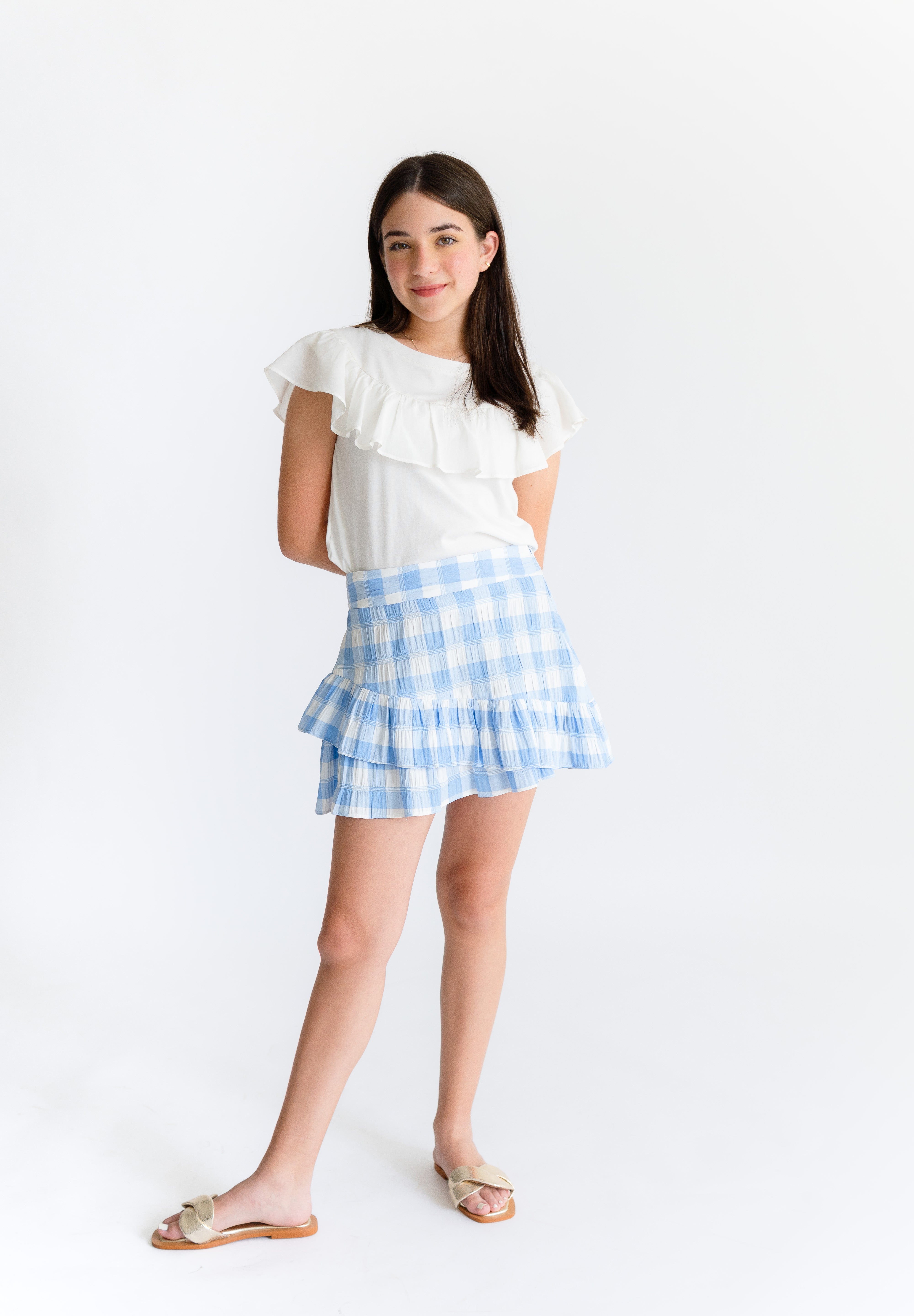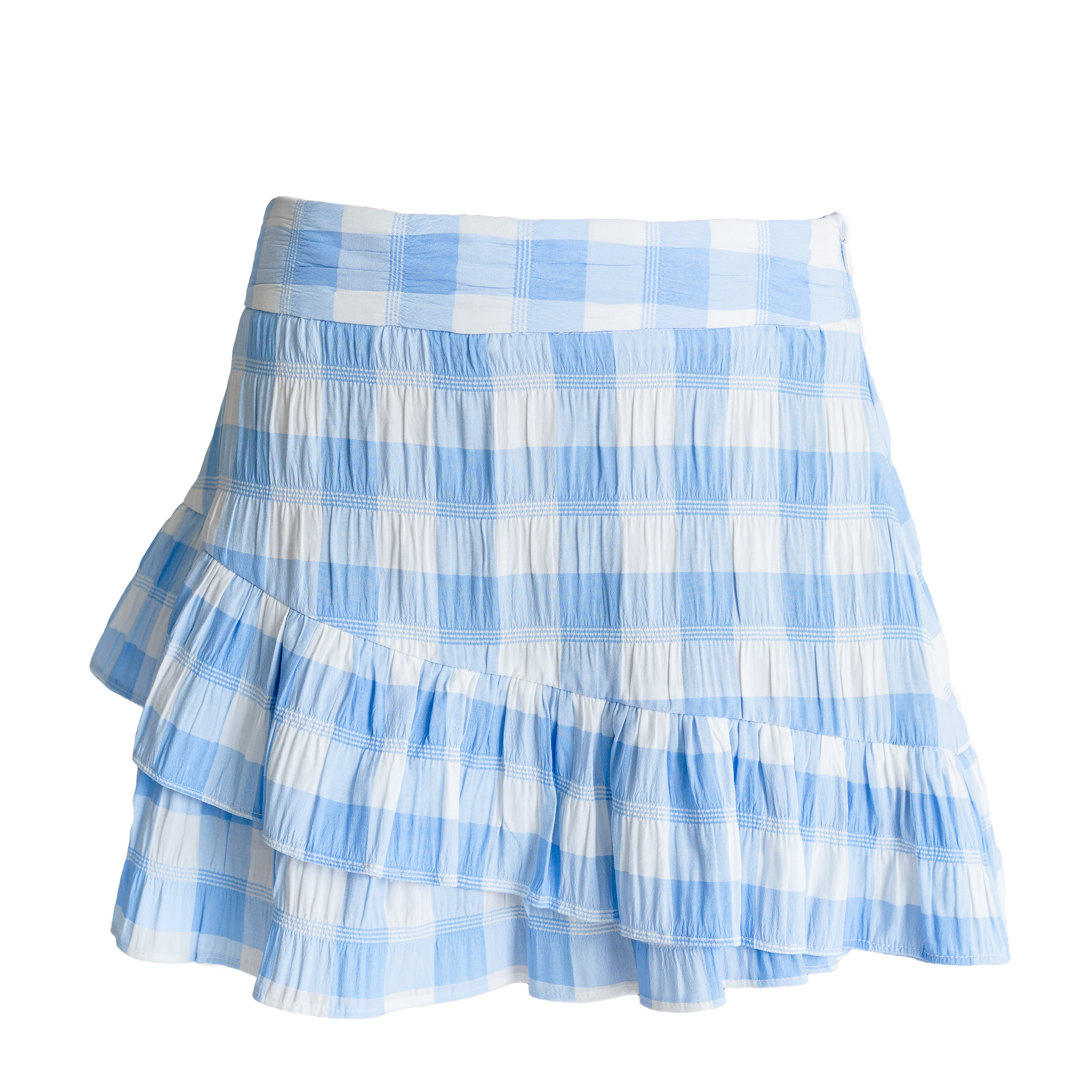 Falda a la cintura, corte asimétrico en cadera con 3 vuelos