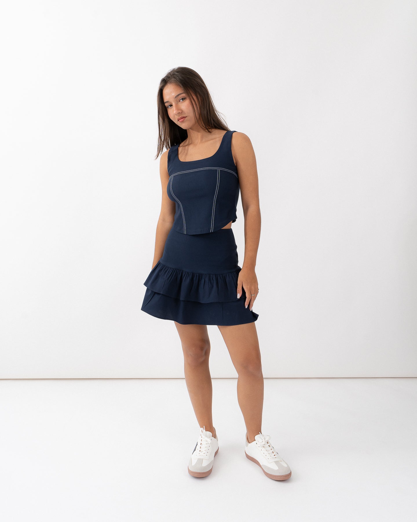 Top con escote profundo redondo manga sisa con detalle de costuras con hilo, contraste sobre cortes.