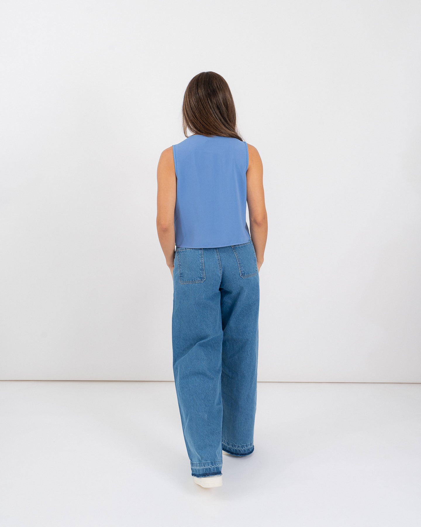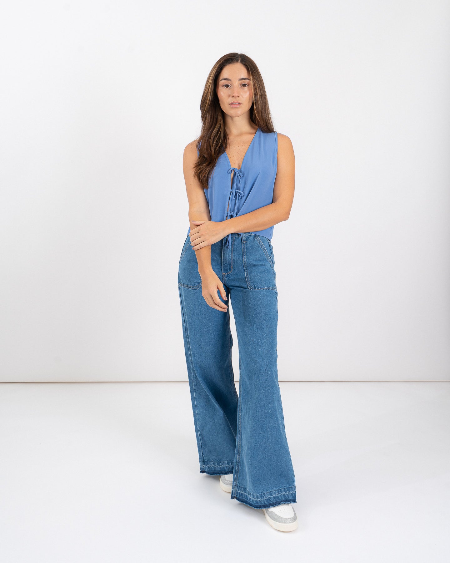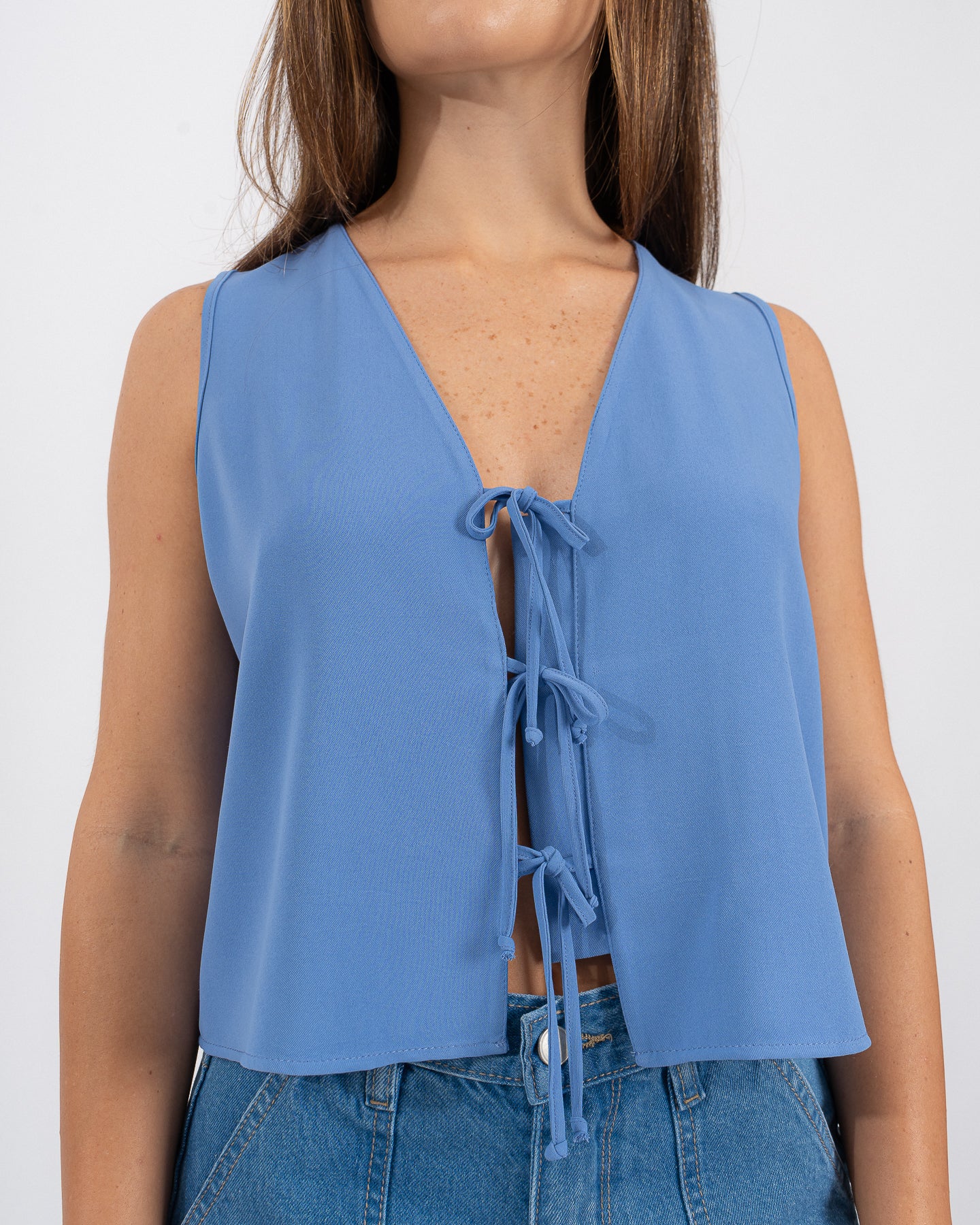 Blusa manga sisa con tiras de amarre en centro delantero y cartera interna.