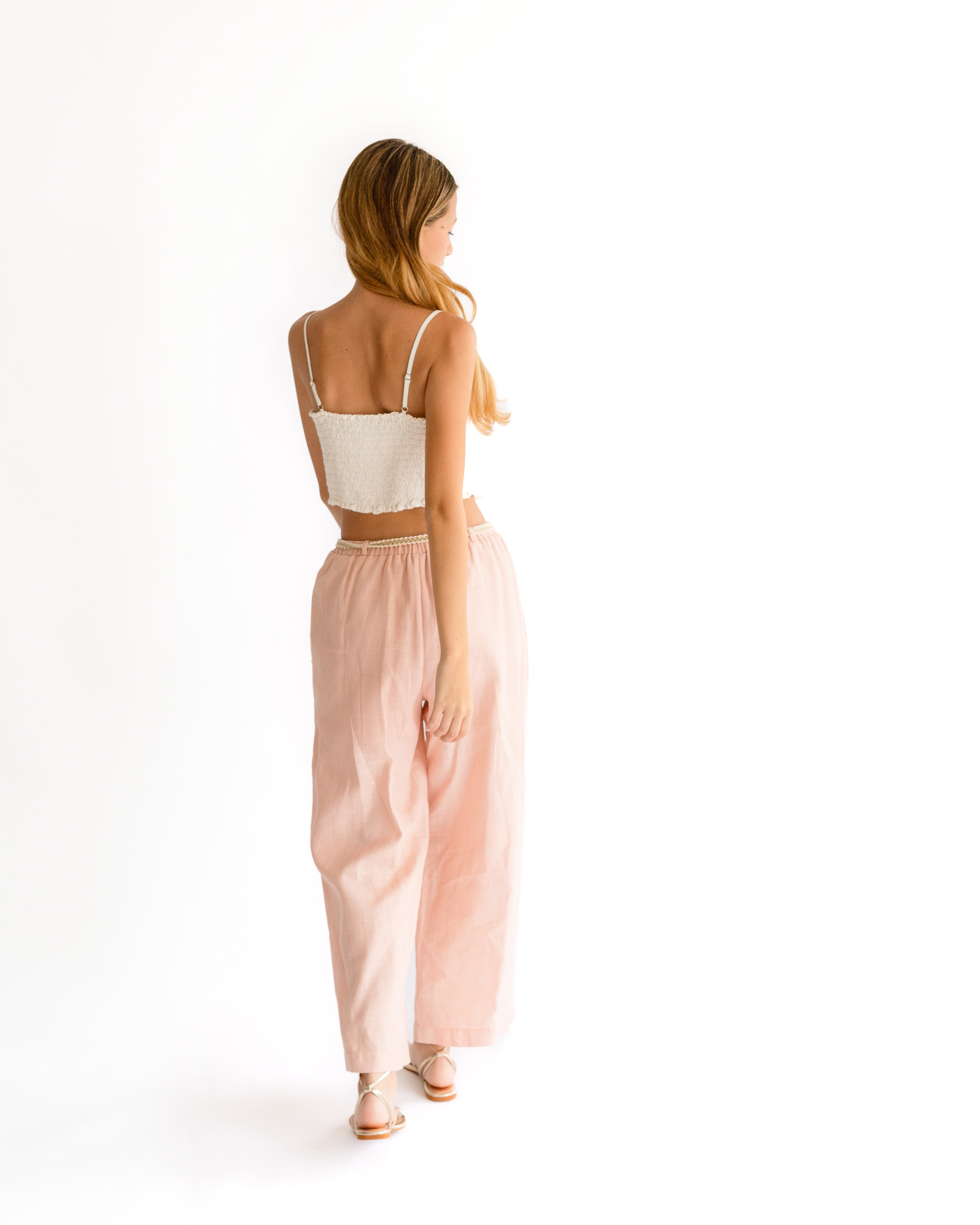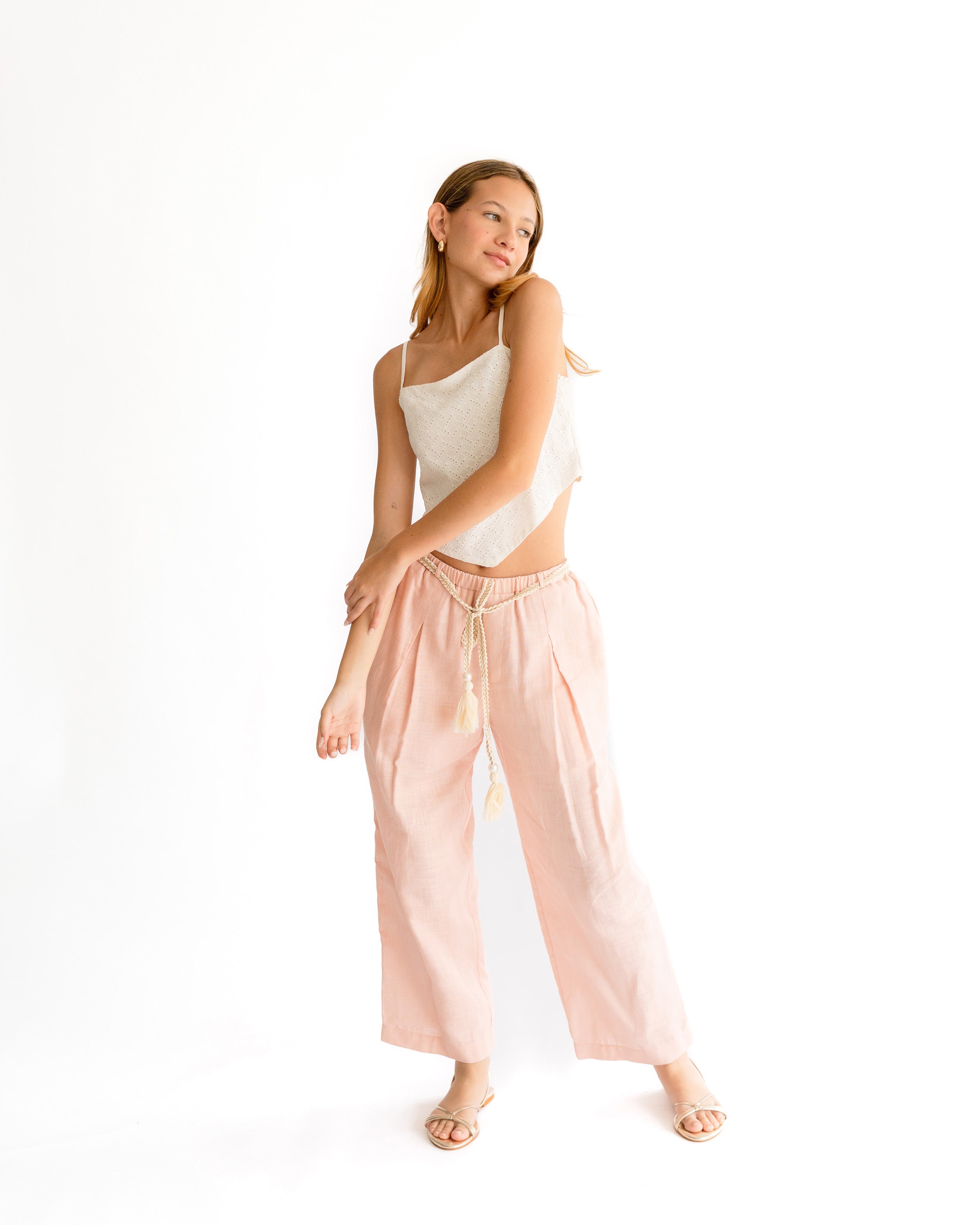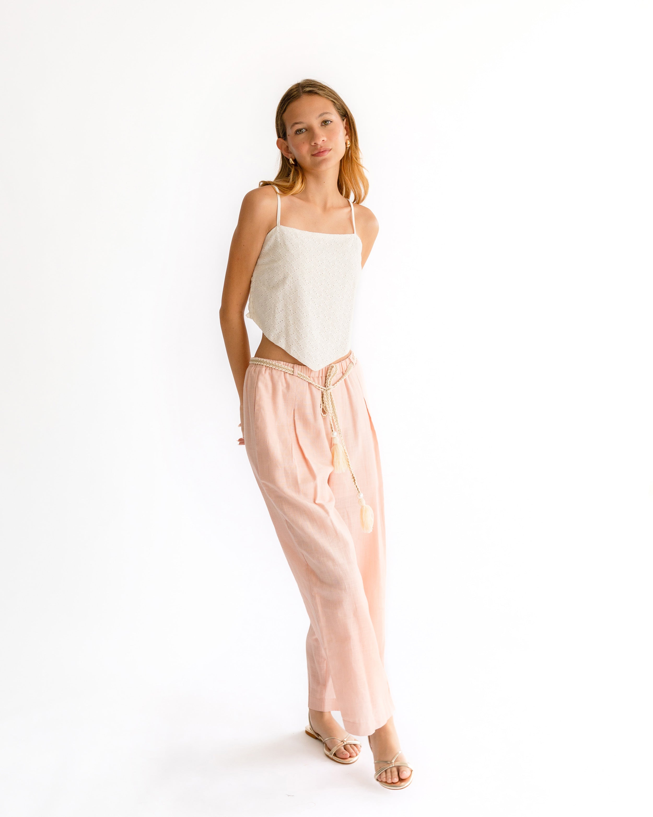 Pantalón de lino, bolsillos laterales con cinturón de cordón.