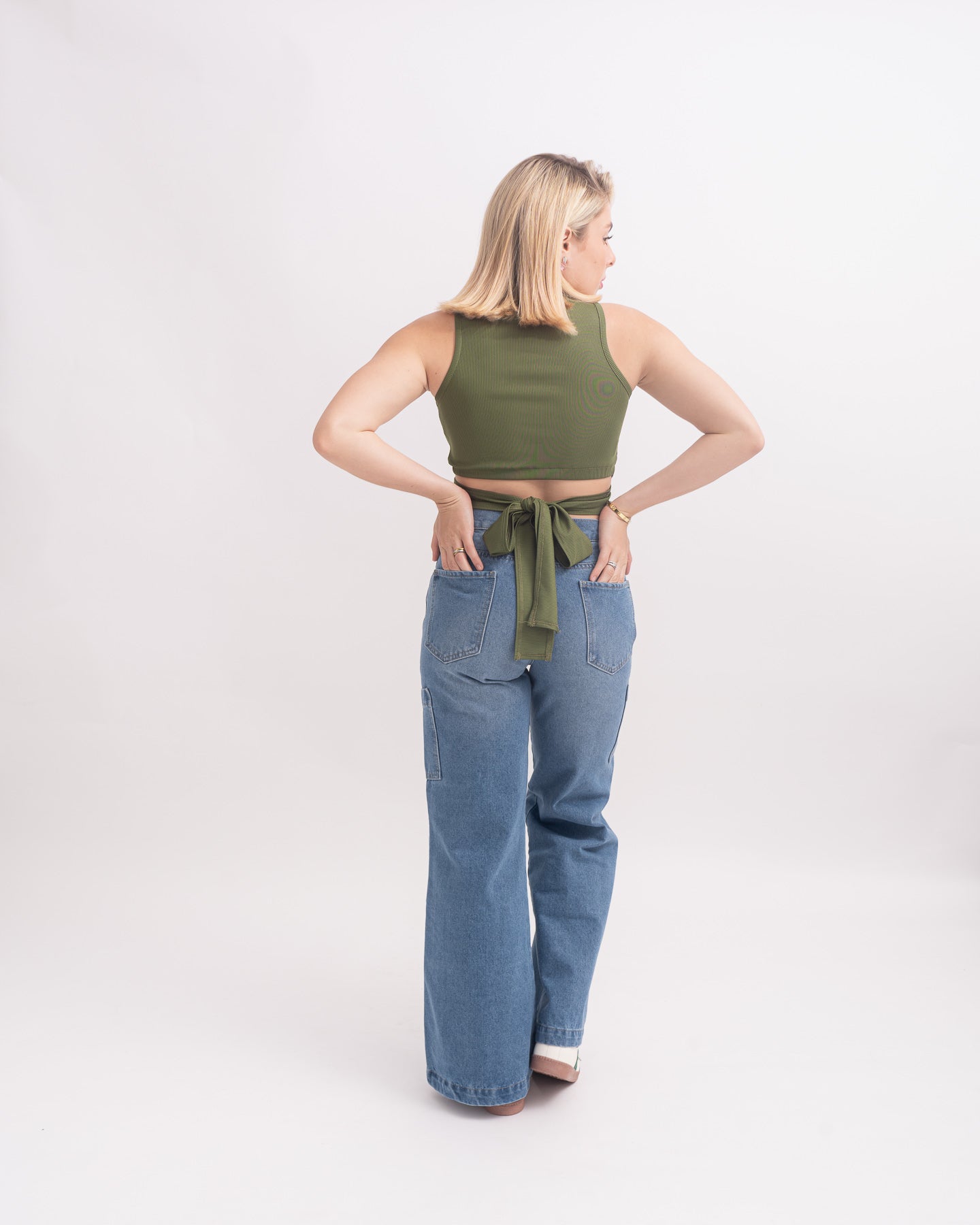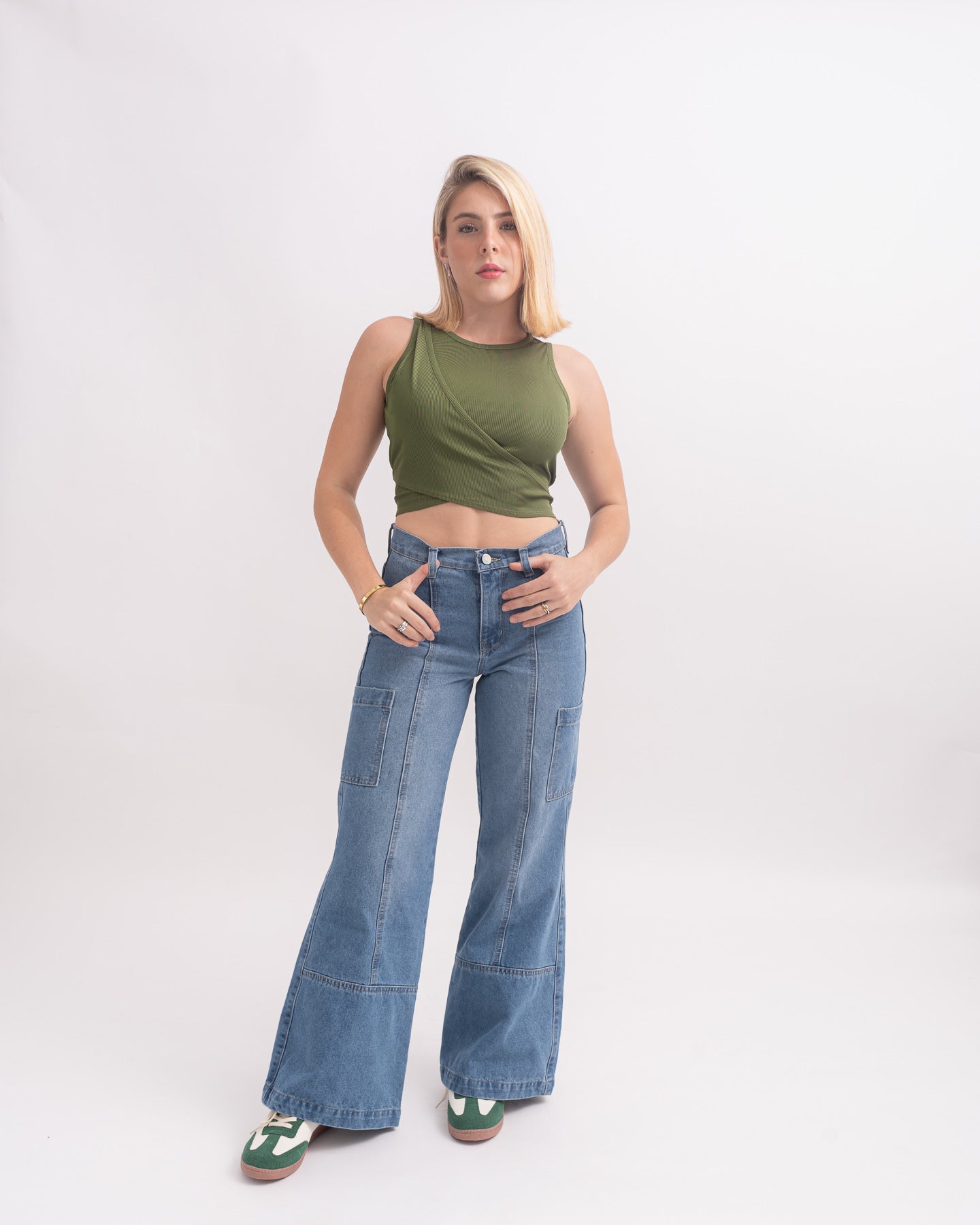 Jean wide leg con bolsillos en lateral y corte central en delantero.