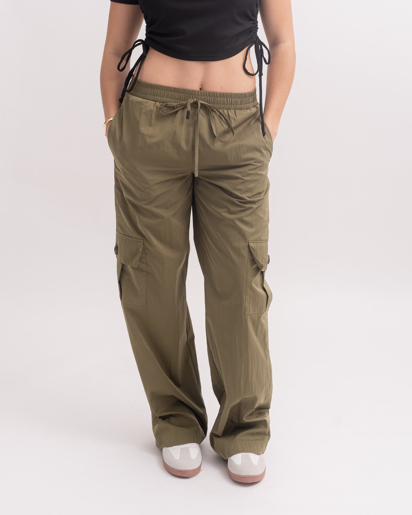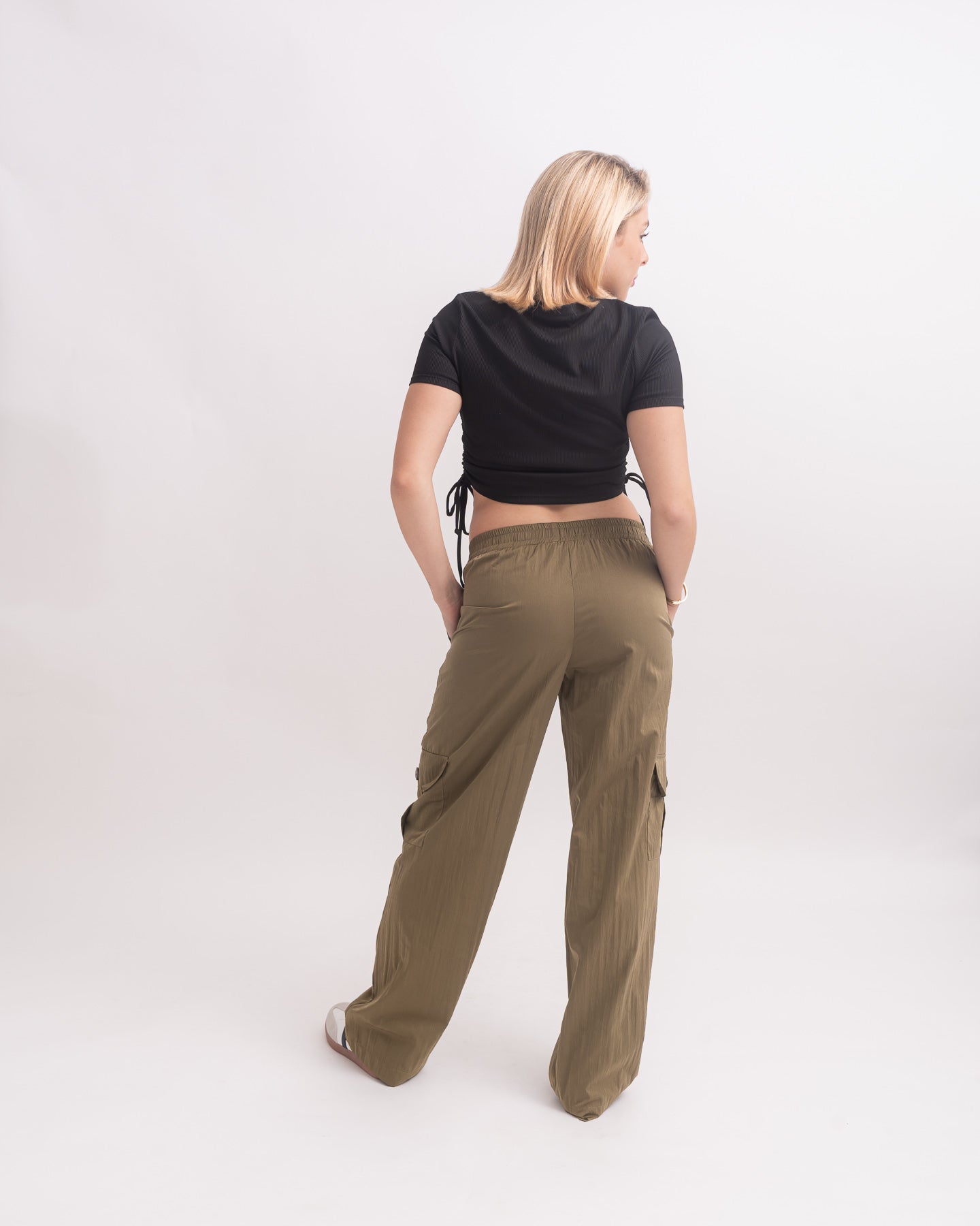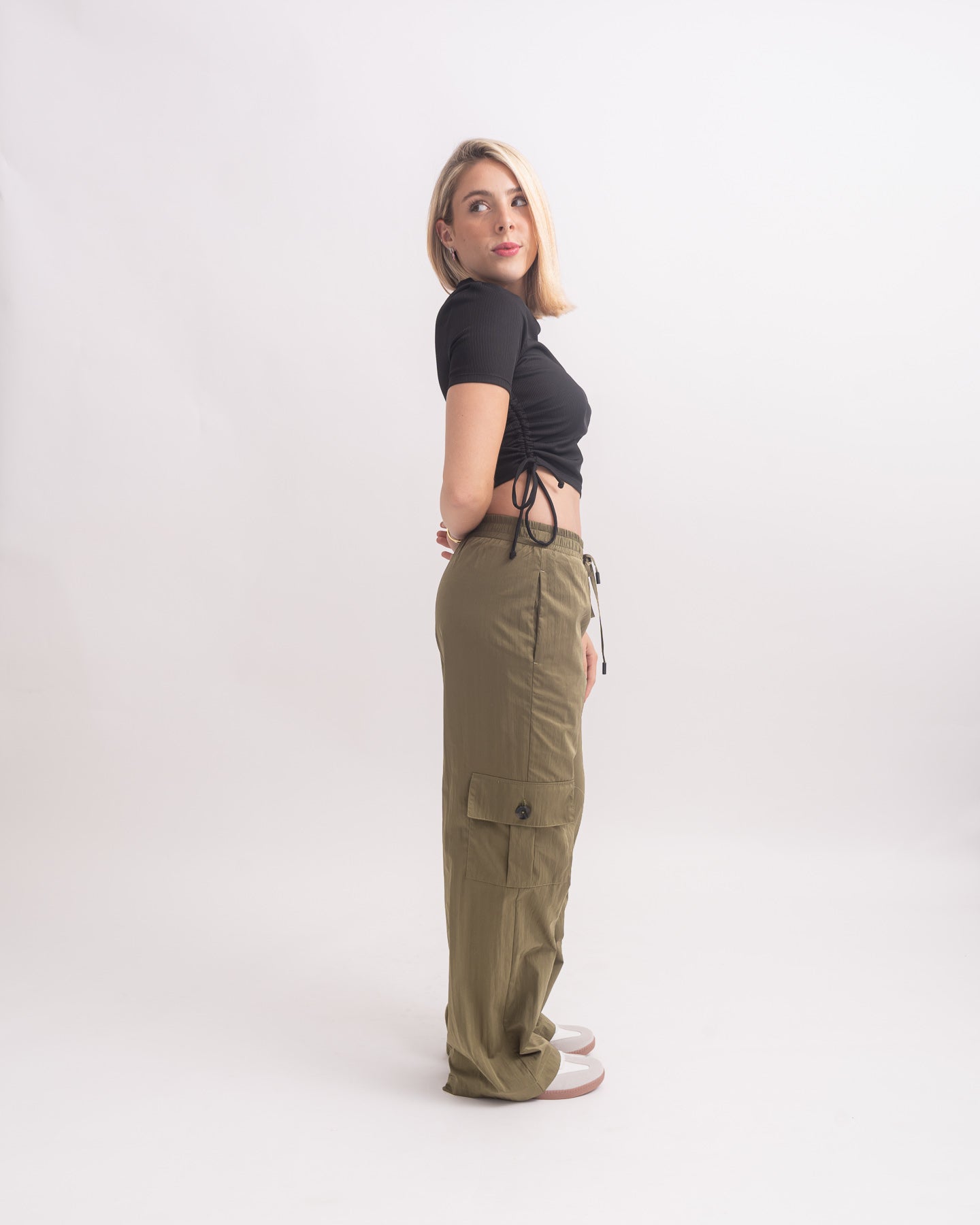 Pantalón con bolsillos cargo y elástico en contorno de cintura y tira decorativa en centro delantero.
