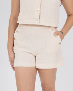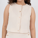 Blusa manga sisa escote redondo con botones dorados en centro delantero.
