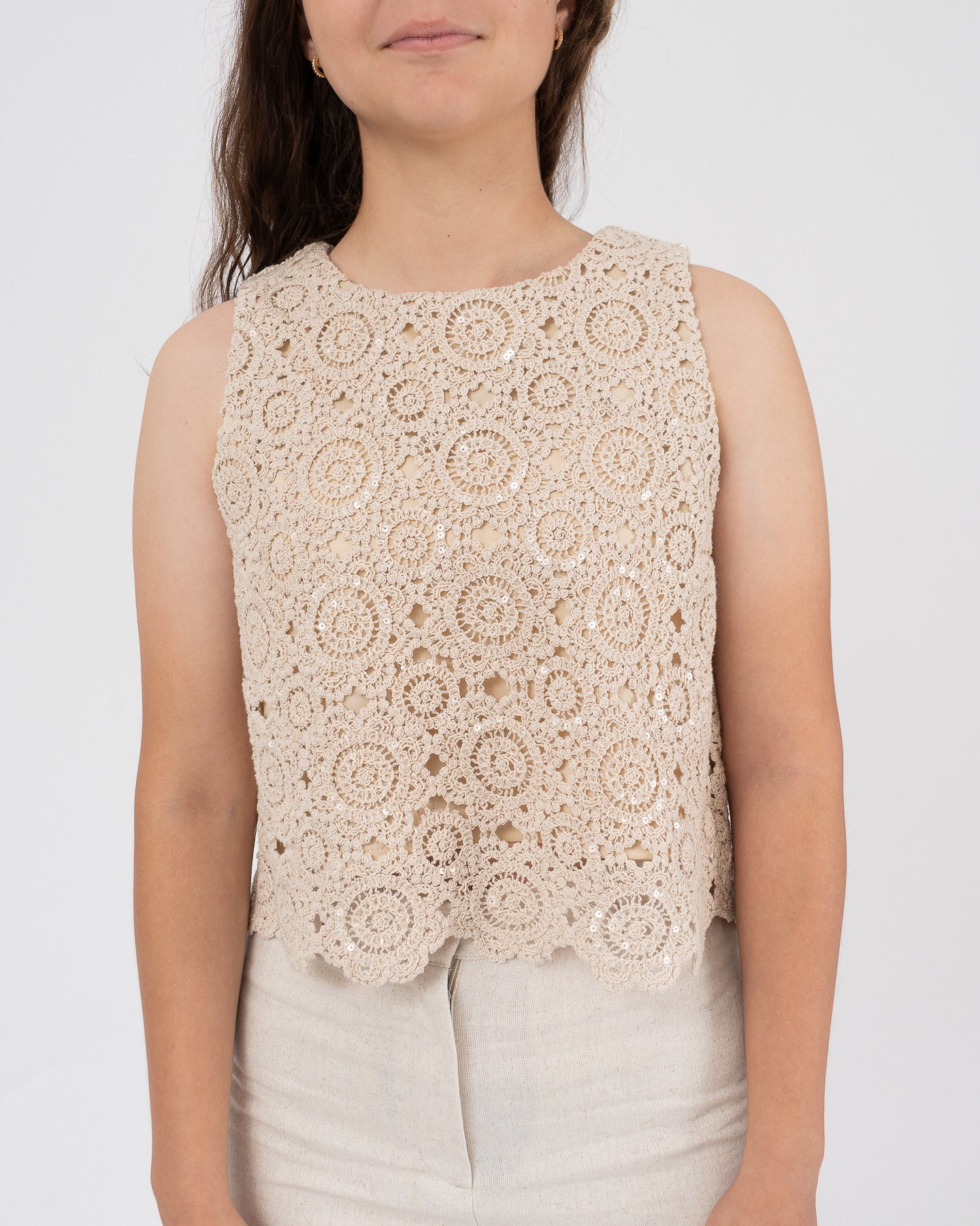 Blusa forrada manga sisa escote redondo con detalle de guarda en ruedo y botón funcional en centro posterior.