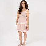 Vestido de tirantes con detalle de reatas en guipur en contorno de bajo busto y canesú.