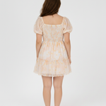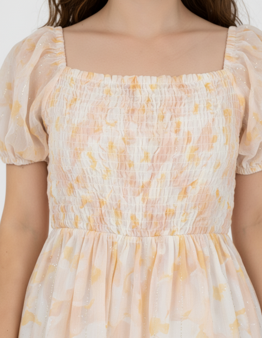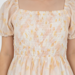 Vestido forrado manga ranglan corta con elástico pasado en puños, nido de abeja en blusa completa y falda amplia con vuelo sobrepuesto.