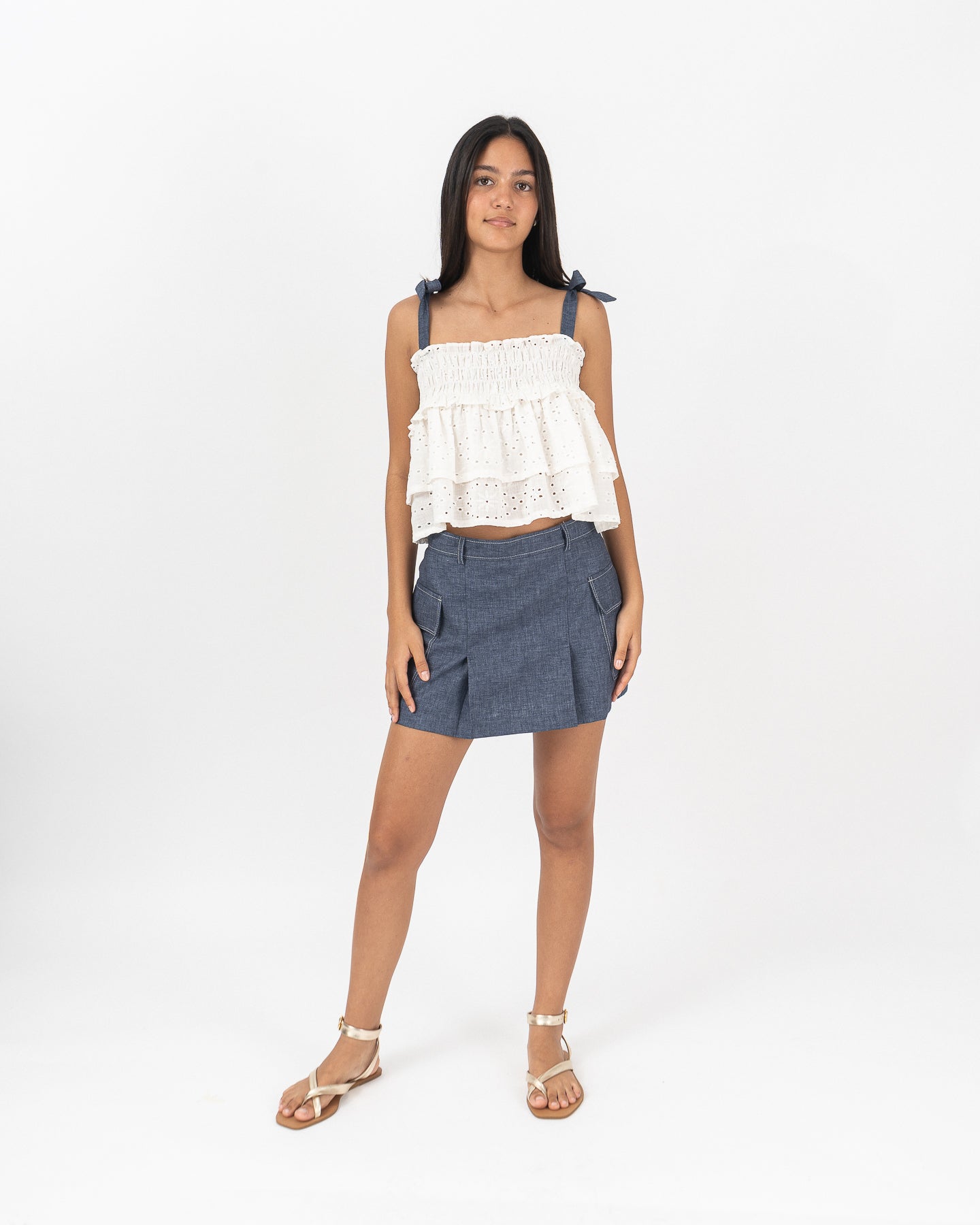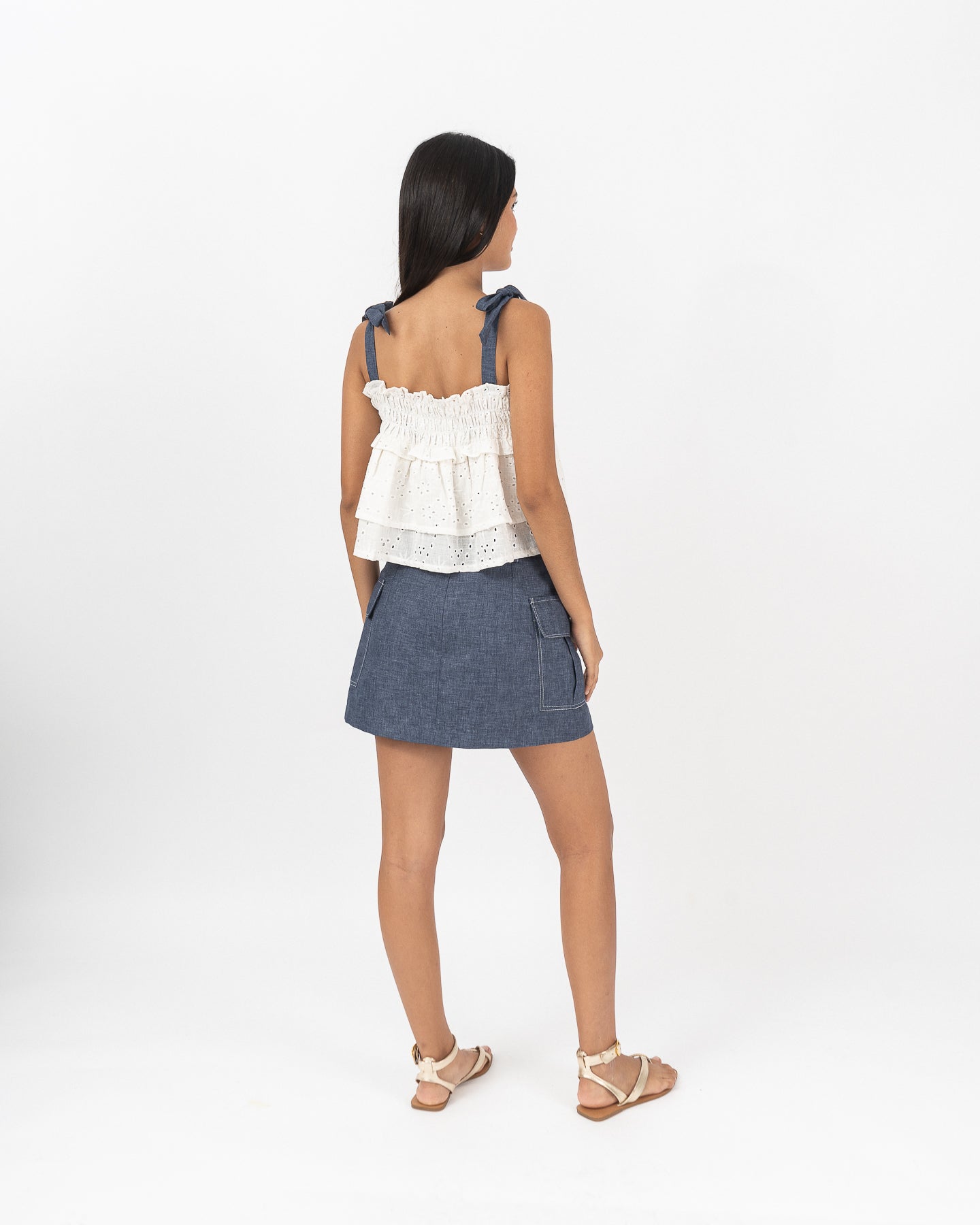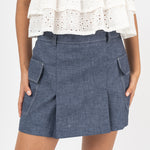 Falda con bolsillos cargo en costados, cierre en centro posterior. Detalle de costuras en contraste y short interno.