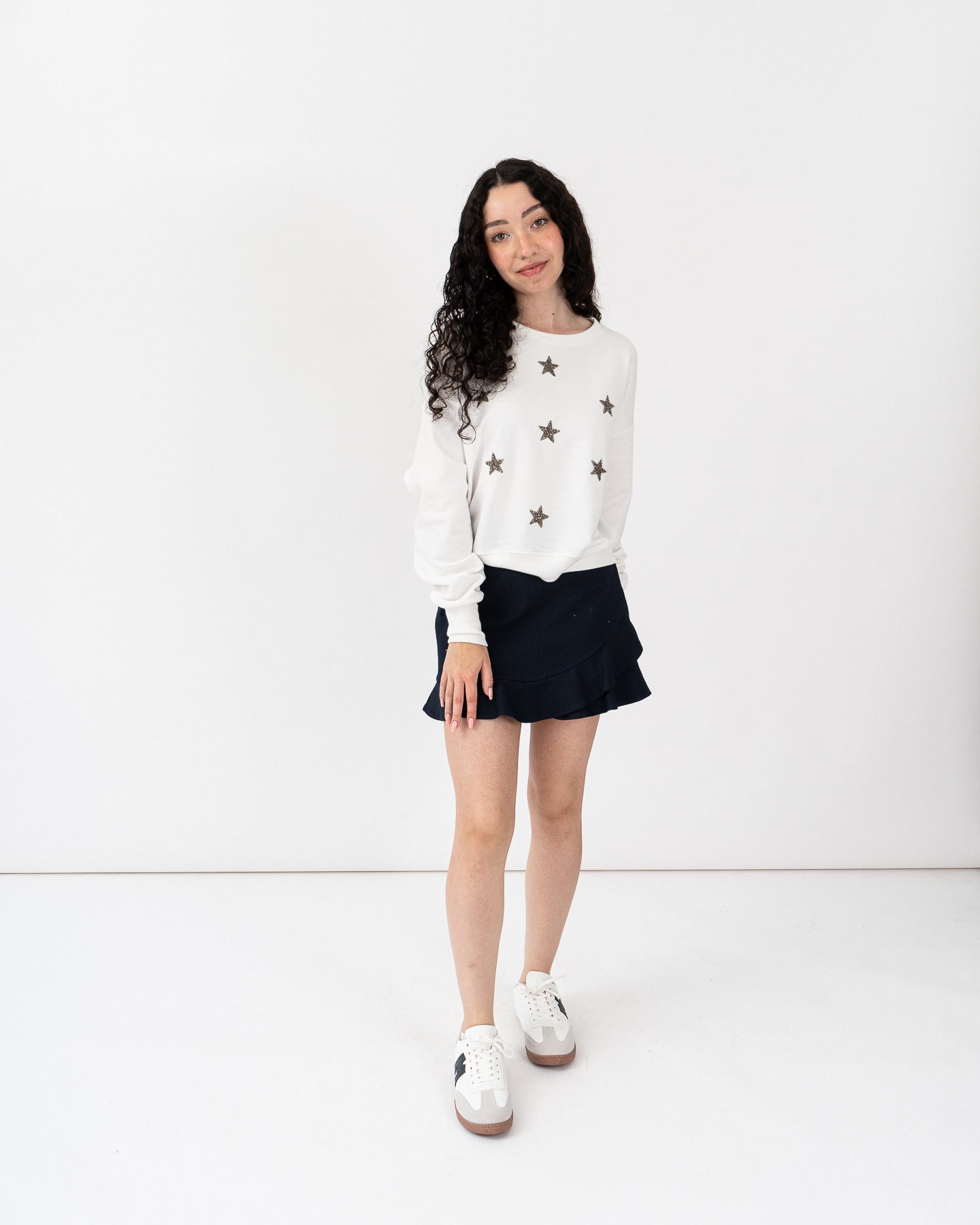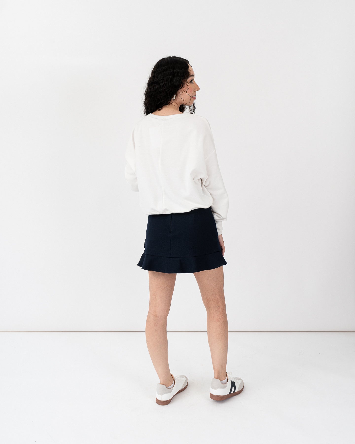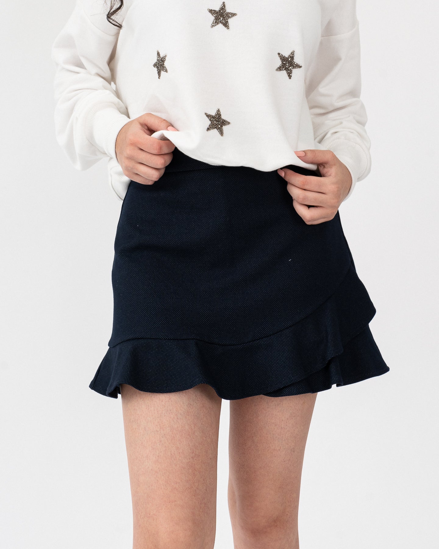 Falda con vuelos encontrados en contorno de ruedo y short interno. Cierre invisible en centro posterior.
