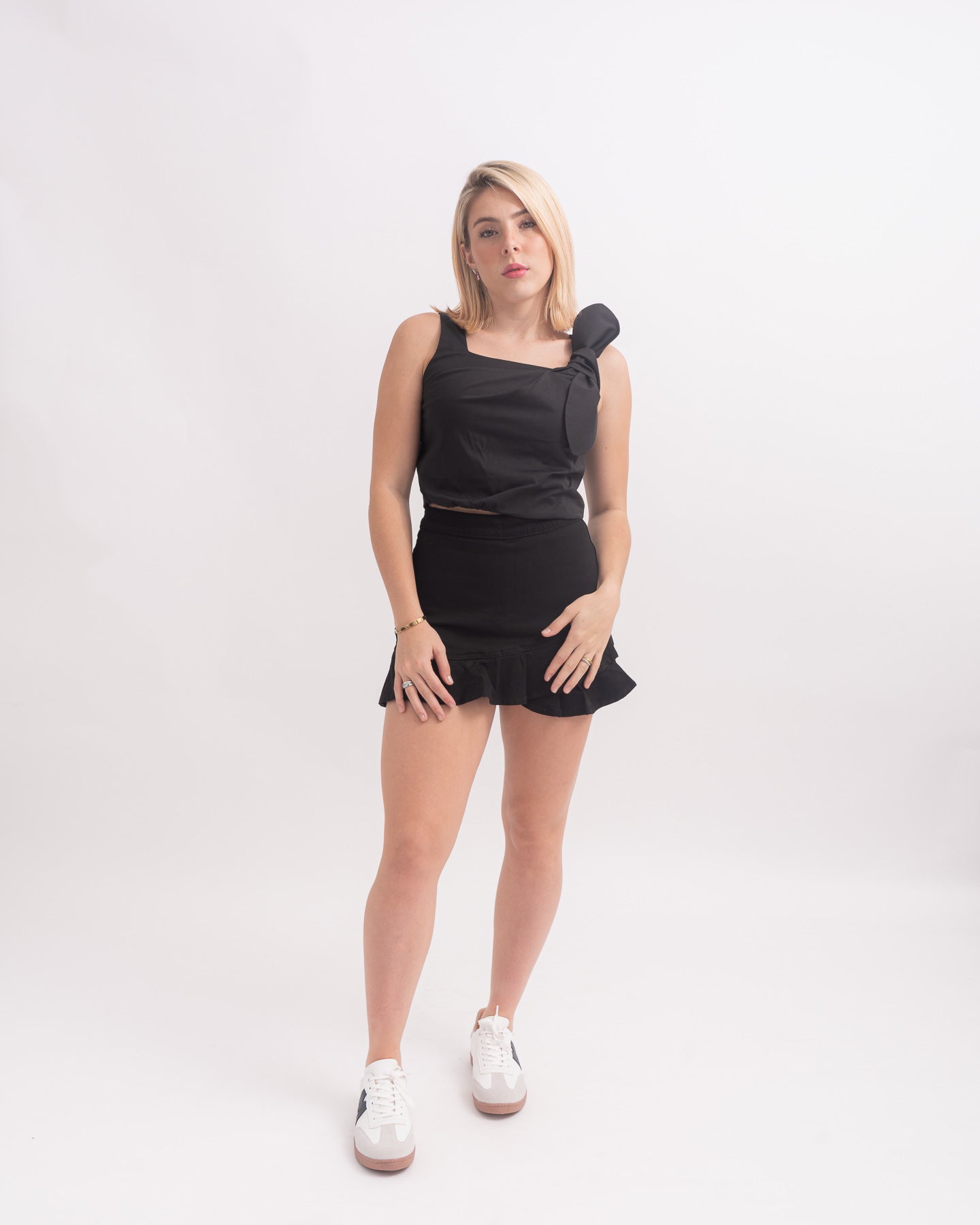 Blusa forrada manga sisa escote cuadrado con detalle de apliques y lazo en hombro izquierdo.