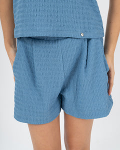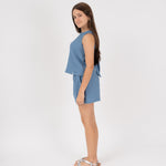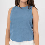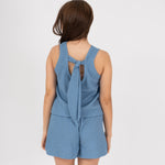 Blusa manga sisa escote redondo con detalle de tiras para amarrar en escote posterior.