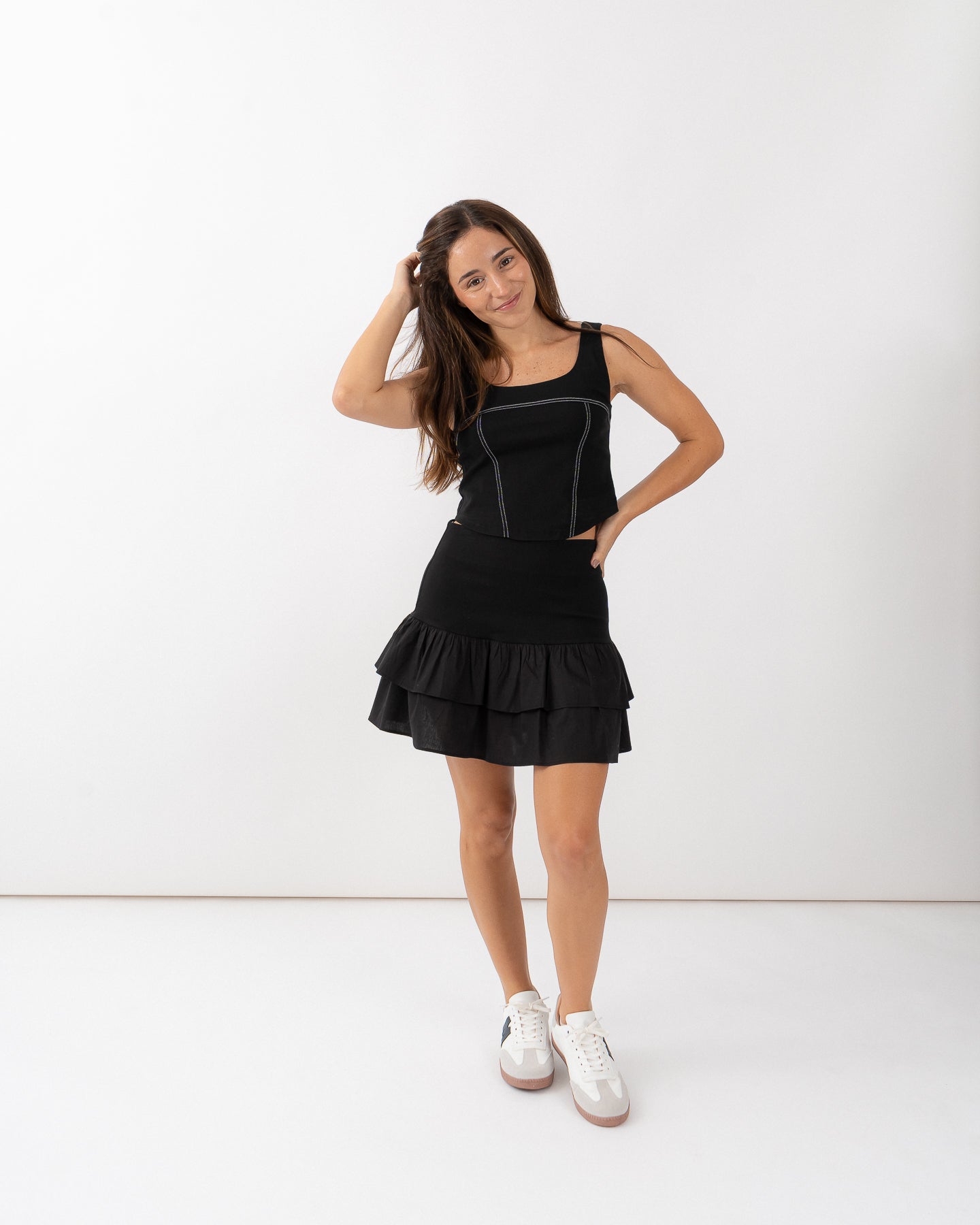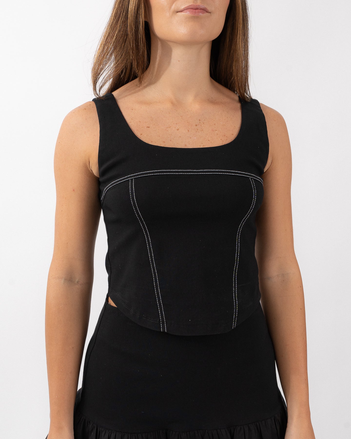 Top con escote profundo redondo manga sisa con detalle de costuras con hilo, contraste sobre cortes.