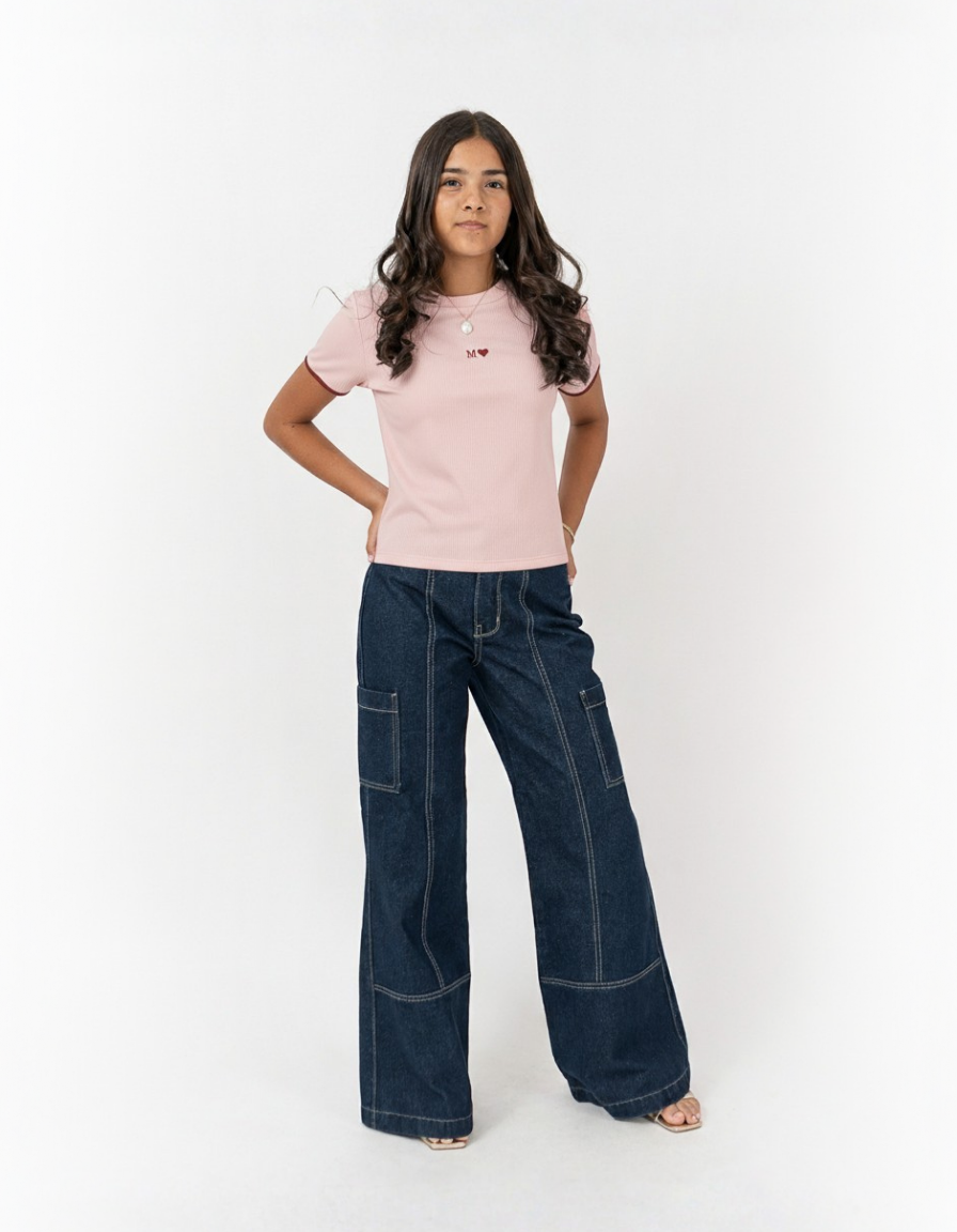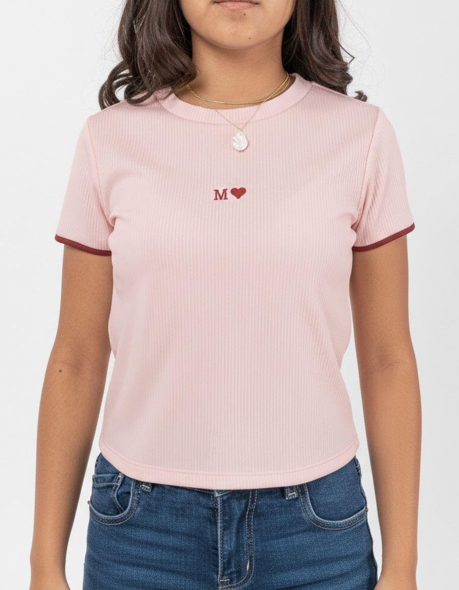 Camiseta manga corta con sesgos en contraste al contorno del puño lleva bordado en centro delantero.
