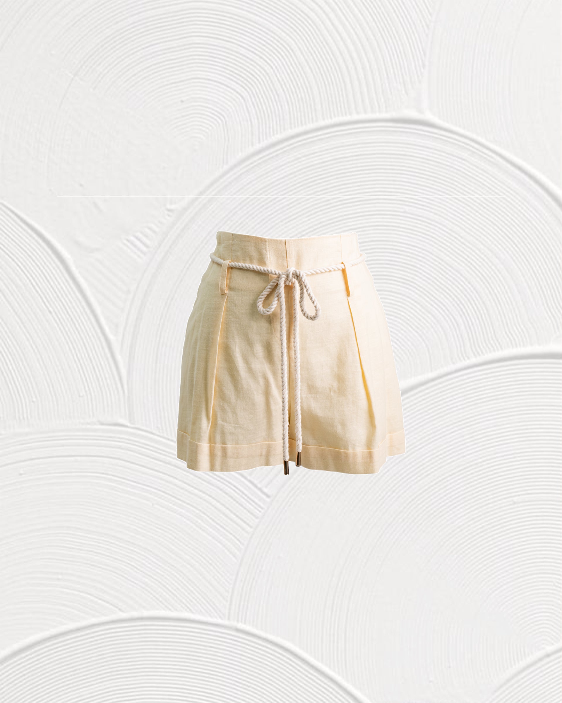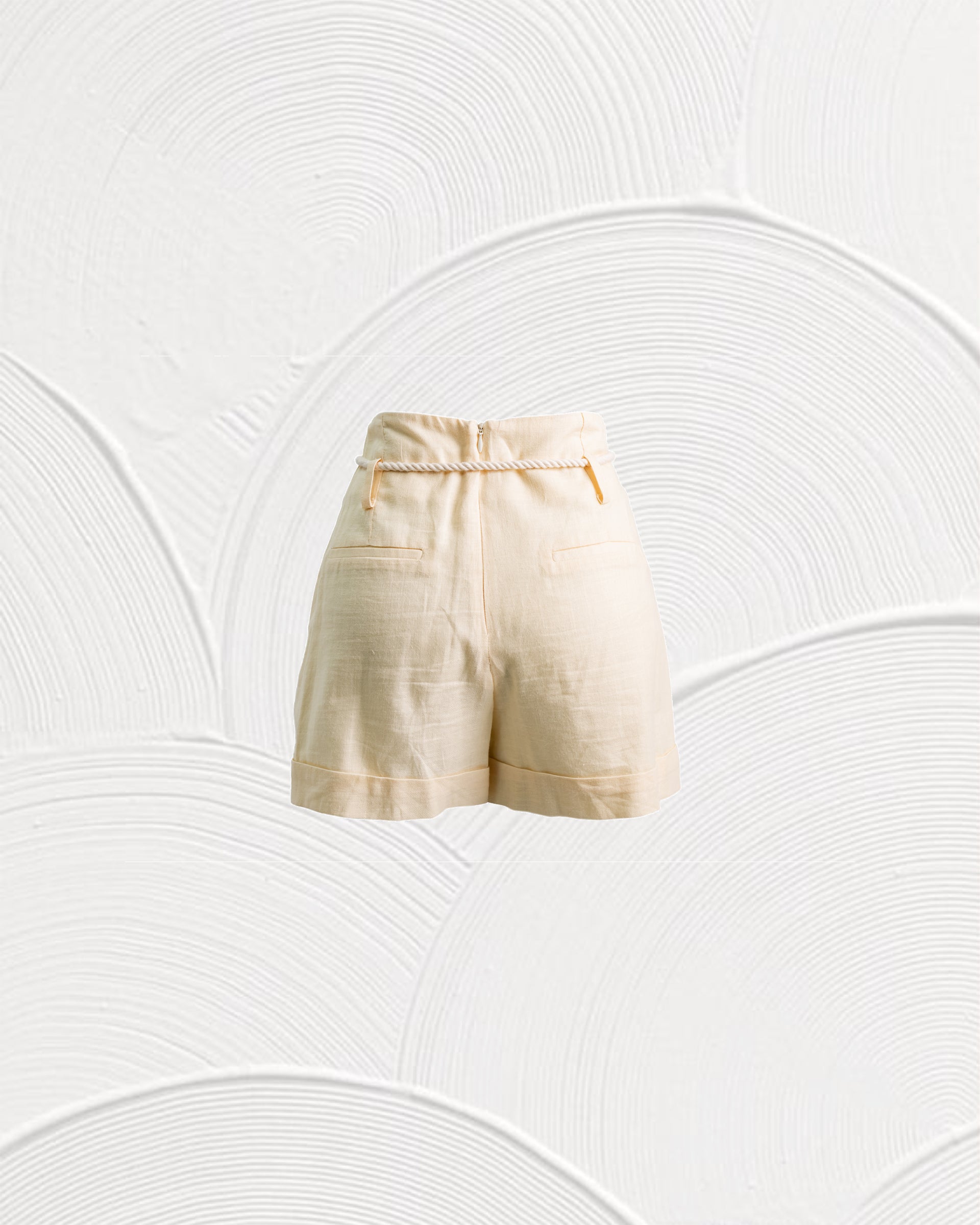 Short amarillo de rayas, tiro alto. Incluye cinturón de la misma tela