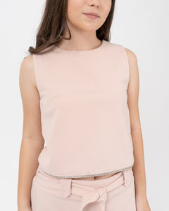 Falda con presillas y tiras de amarre en delantero, elástico pasado en pretina posterior. Detalle de aplique en ruedo delantero.