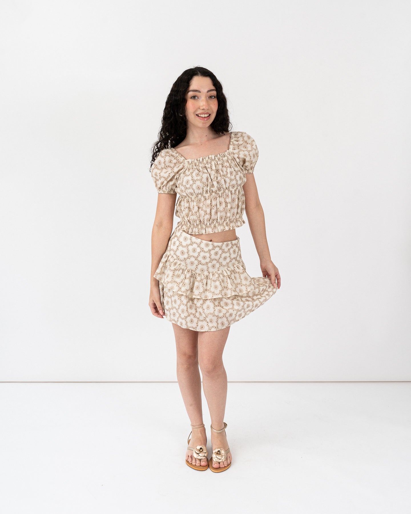 Falda forrada con corte canusú y capas de vuelos con recogido en contorno.
