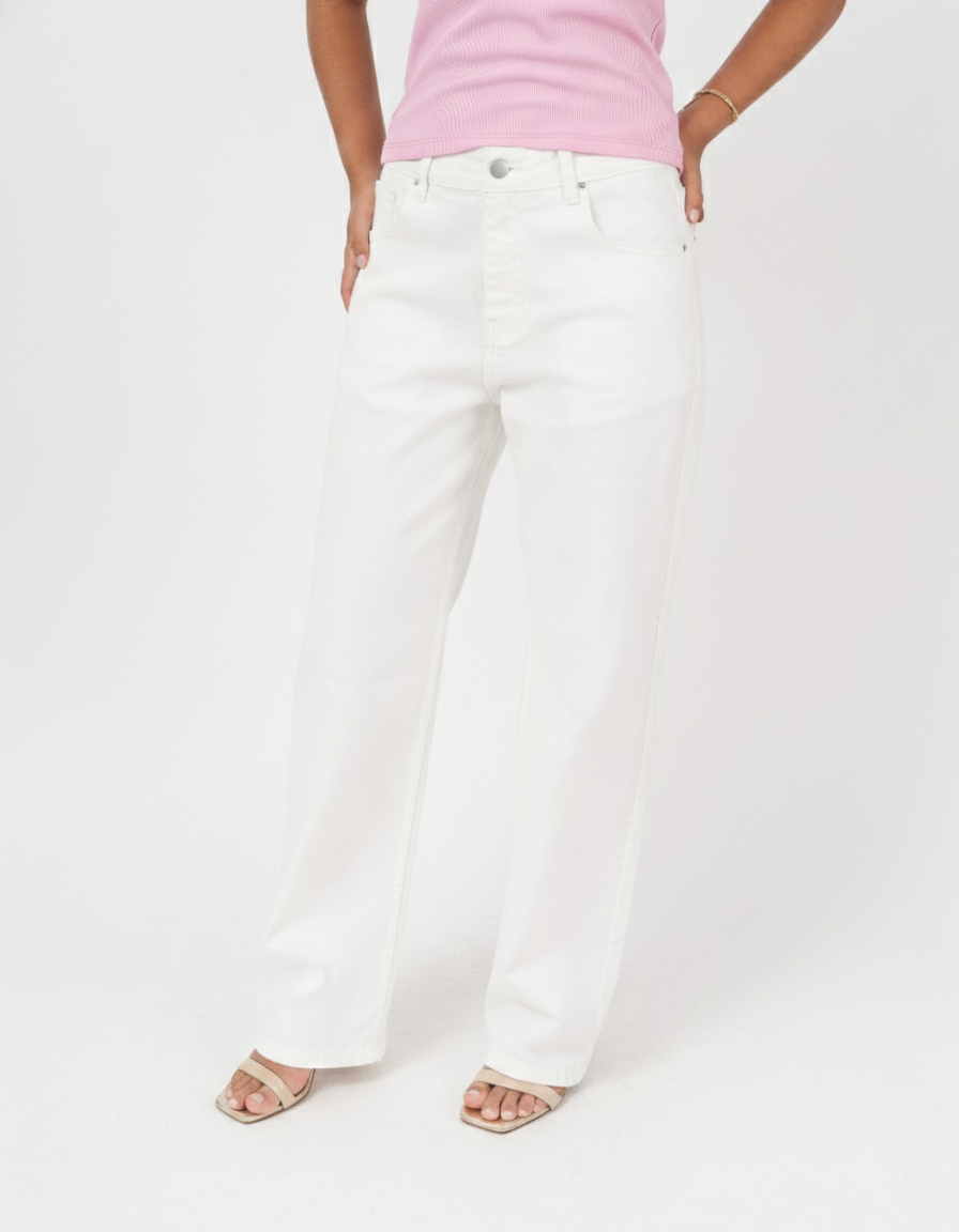 Pantalón denim color crudo corte recto con detalle de elástico en cintura