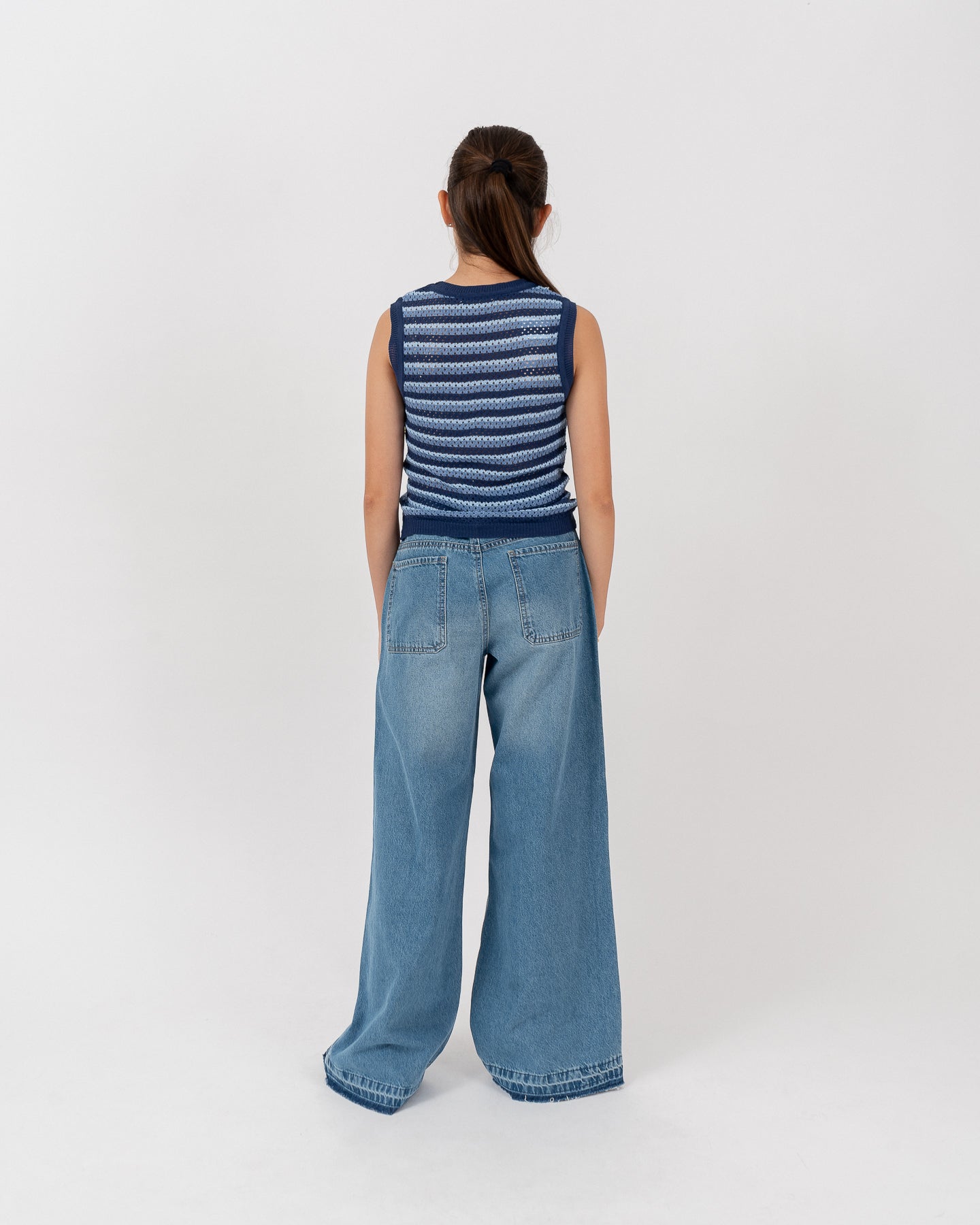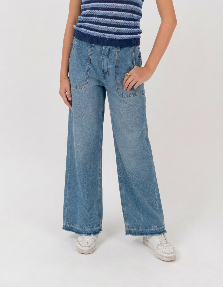 Pantalón denim corte wide leg con bolsillos delanteros.