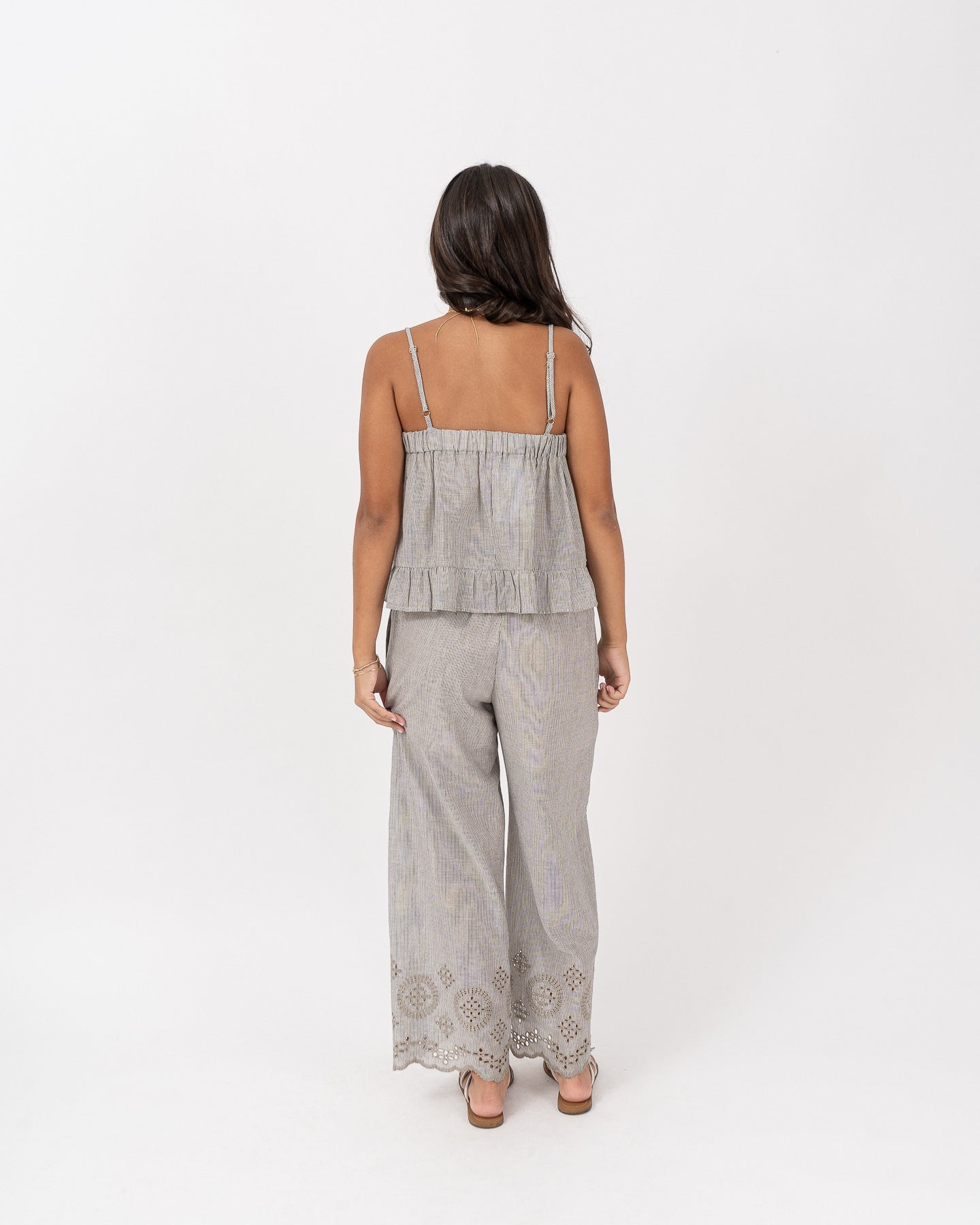 Pantalón con short interno, bolsillos funcionales en costados, elástico pasado en contorno de cintura bota con guarda bordada.