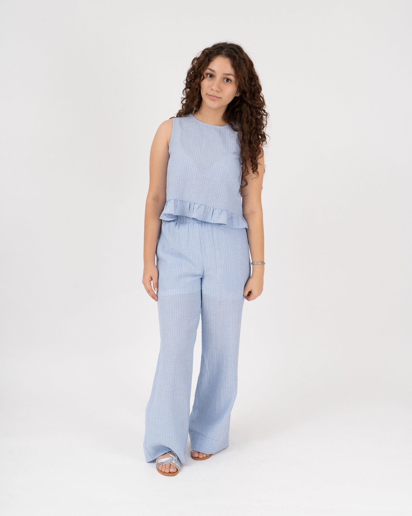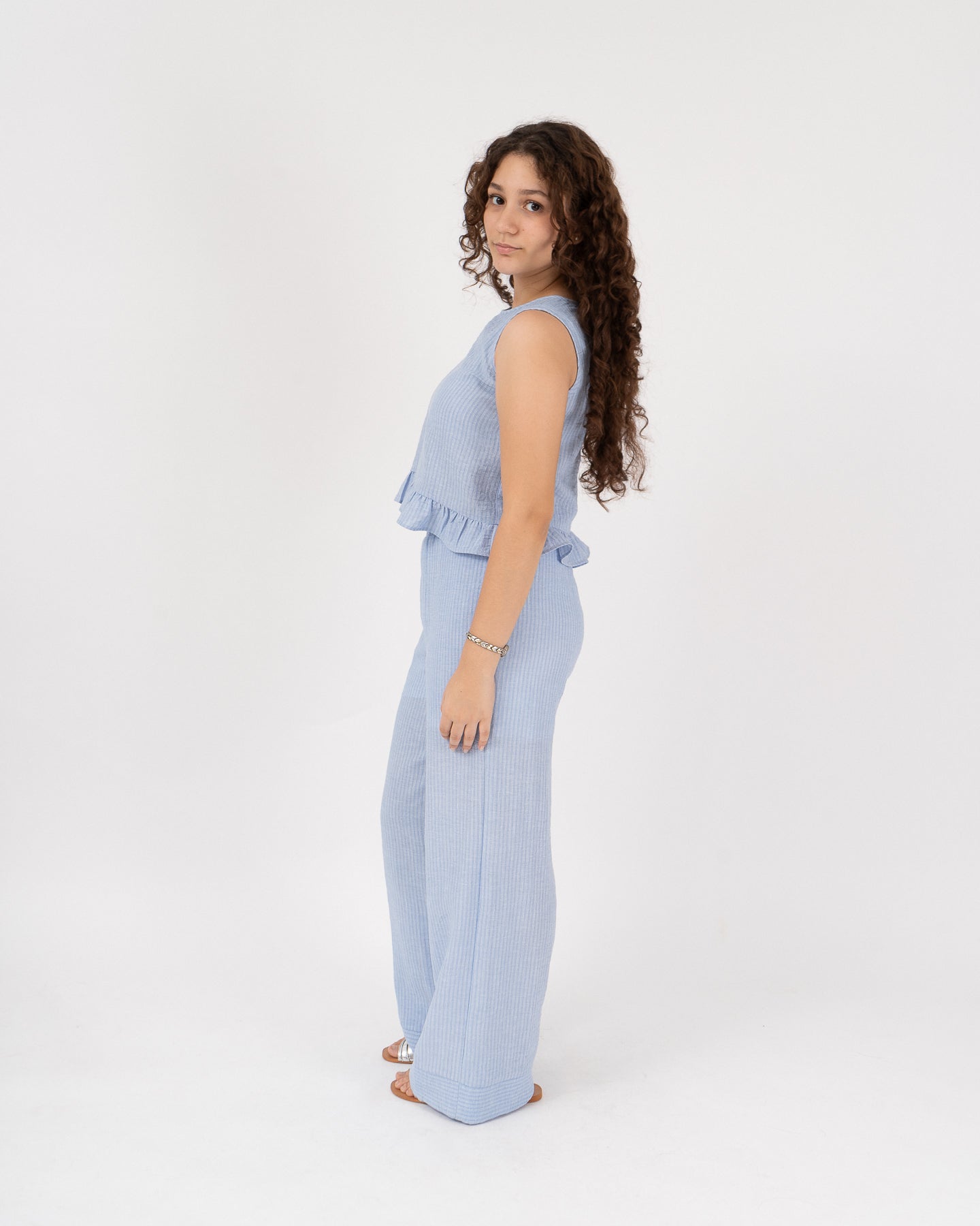 Pantalón forrado con elástico pasado en contorno de cintura.