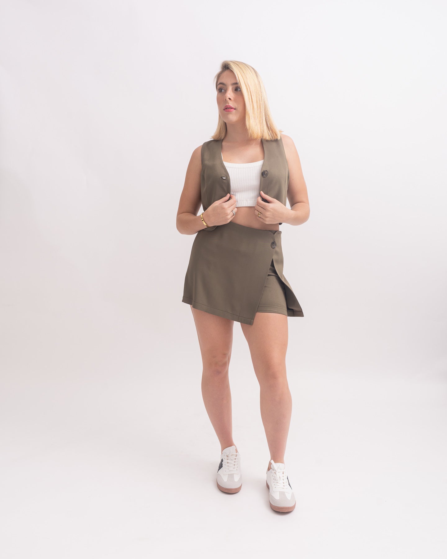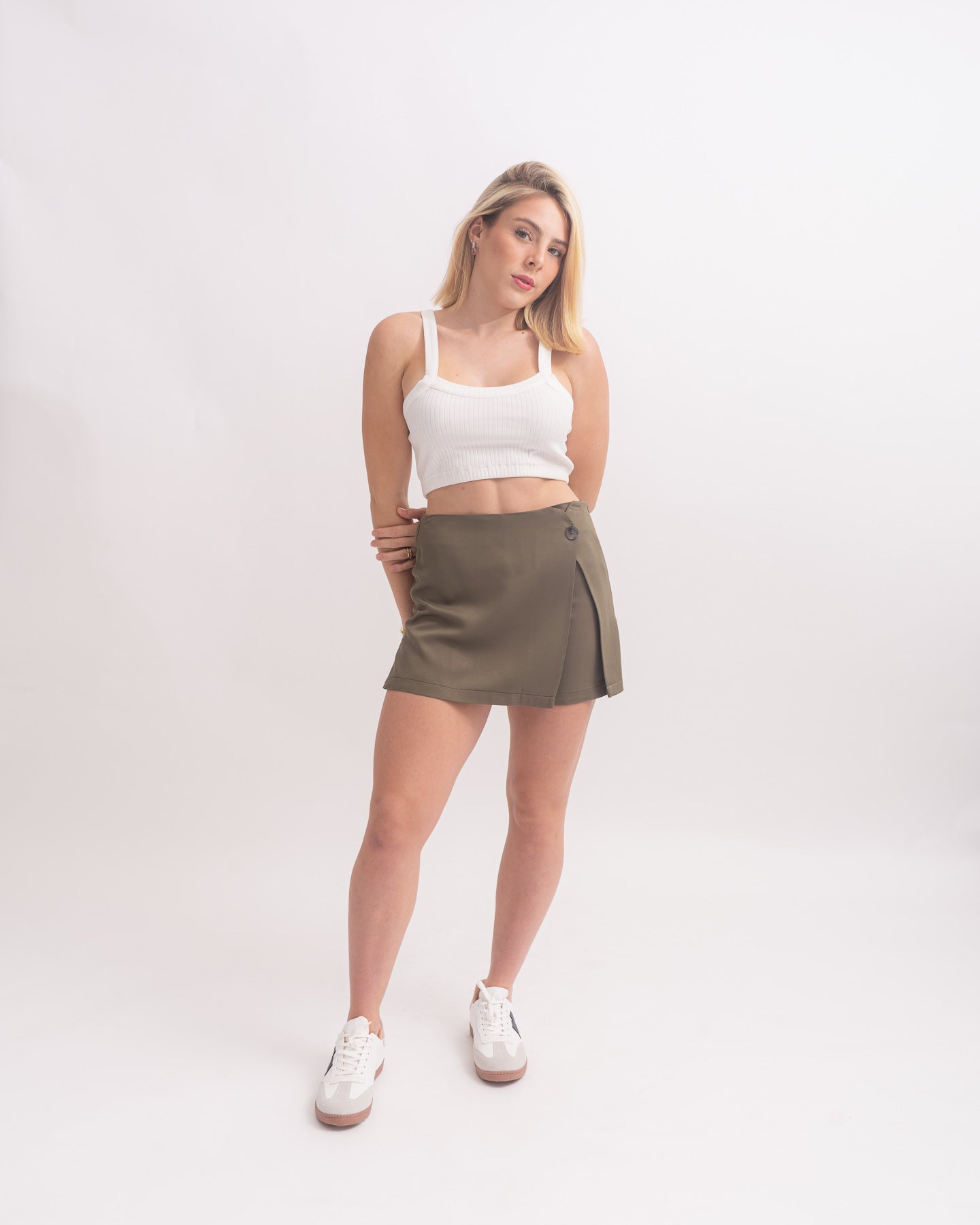 Falda short a la cintura con tablón.