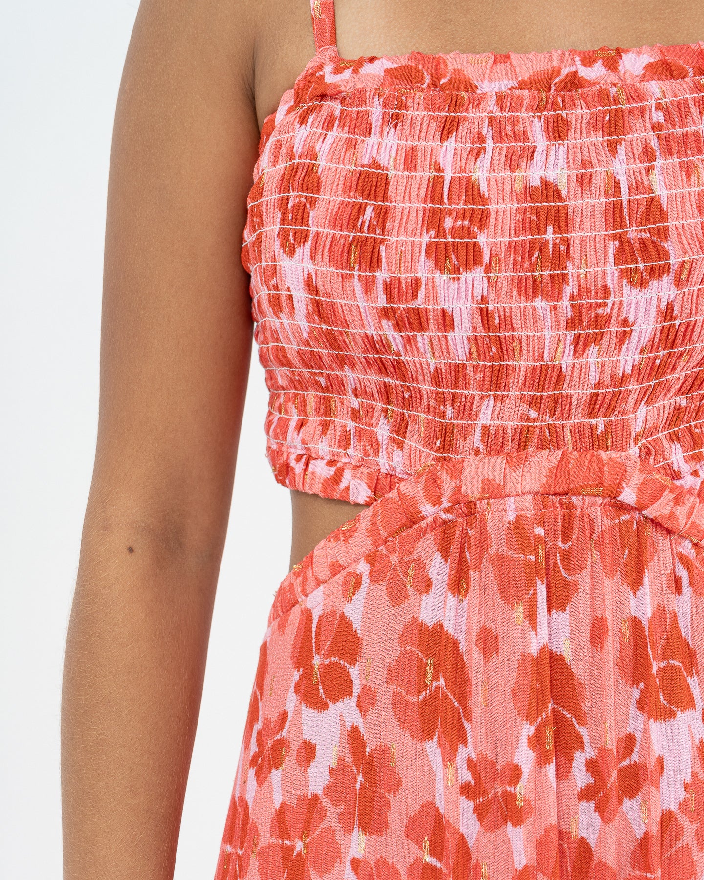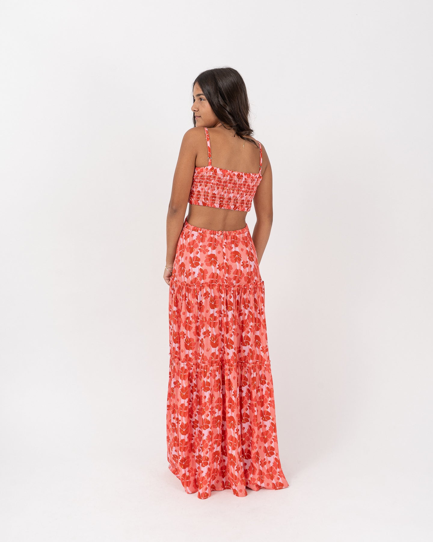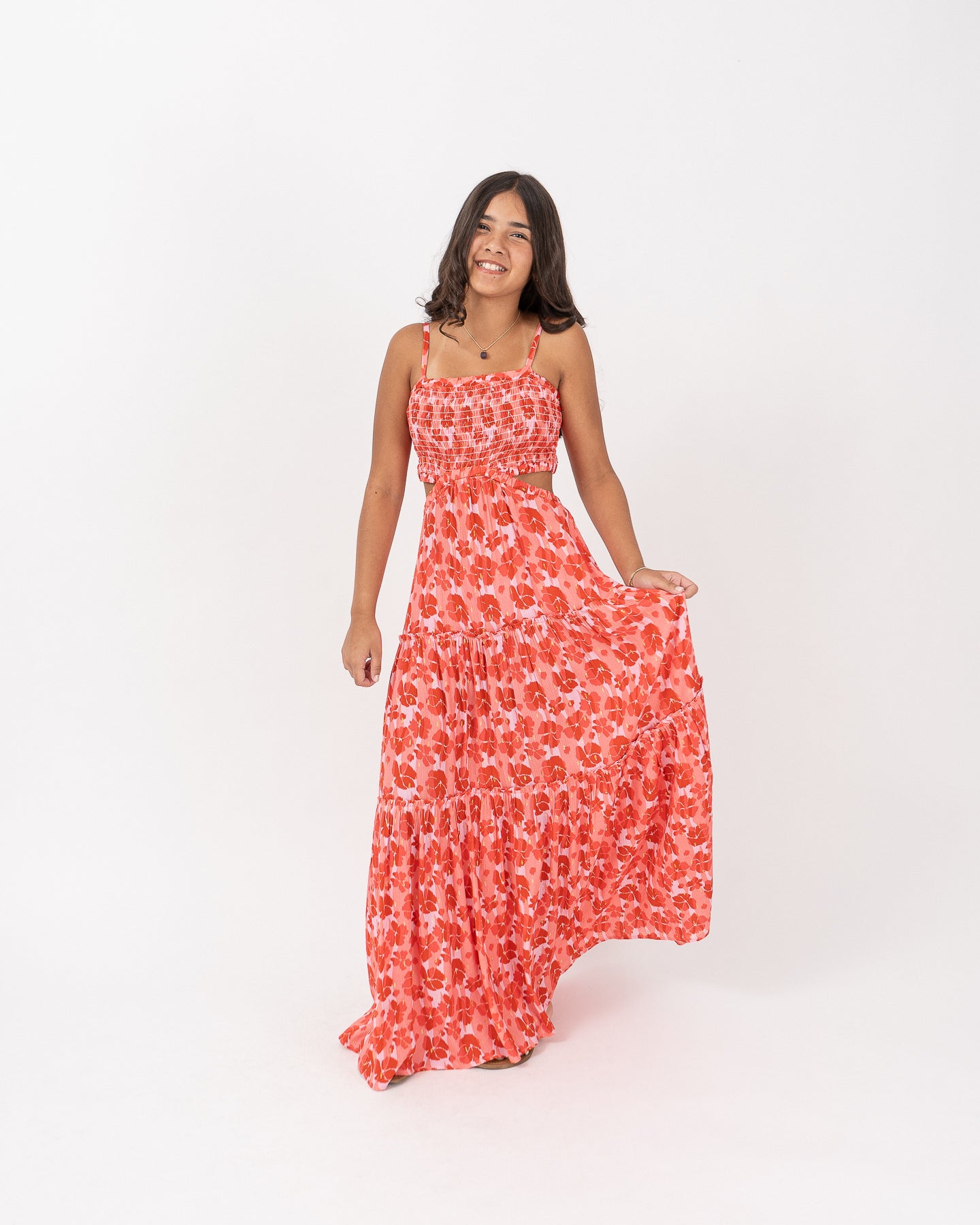 Vestido cut out de tirantes con reguladores, blusa con nido de abeja. Falda larga de capas con recogido.