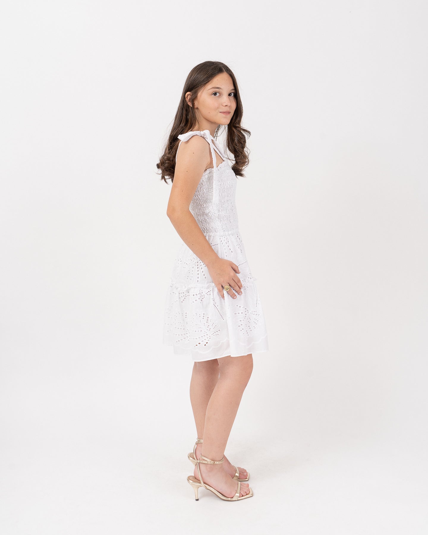 Vestido con tiras de amarre, blusa en nido de abeja, elástico pasado en contorno de cintura, falda con vuelo recogido en contorno de ruedo.