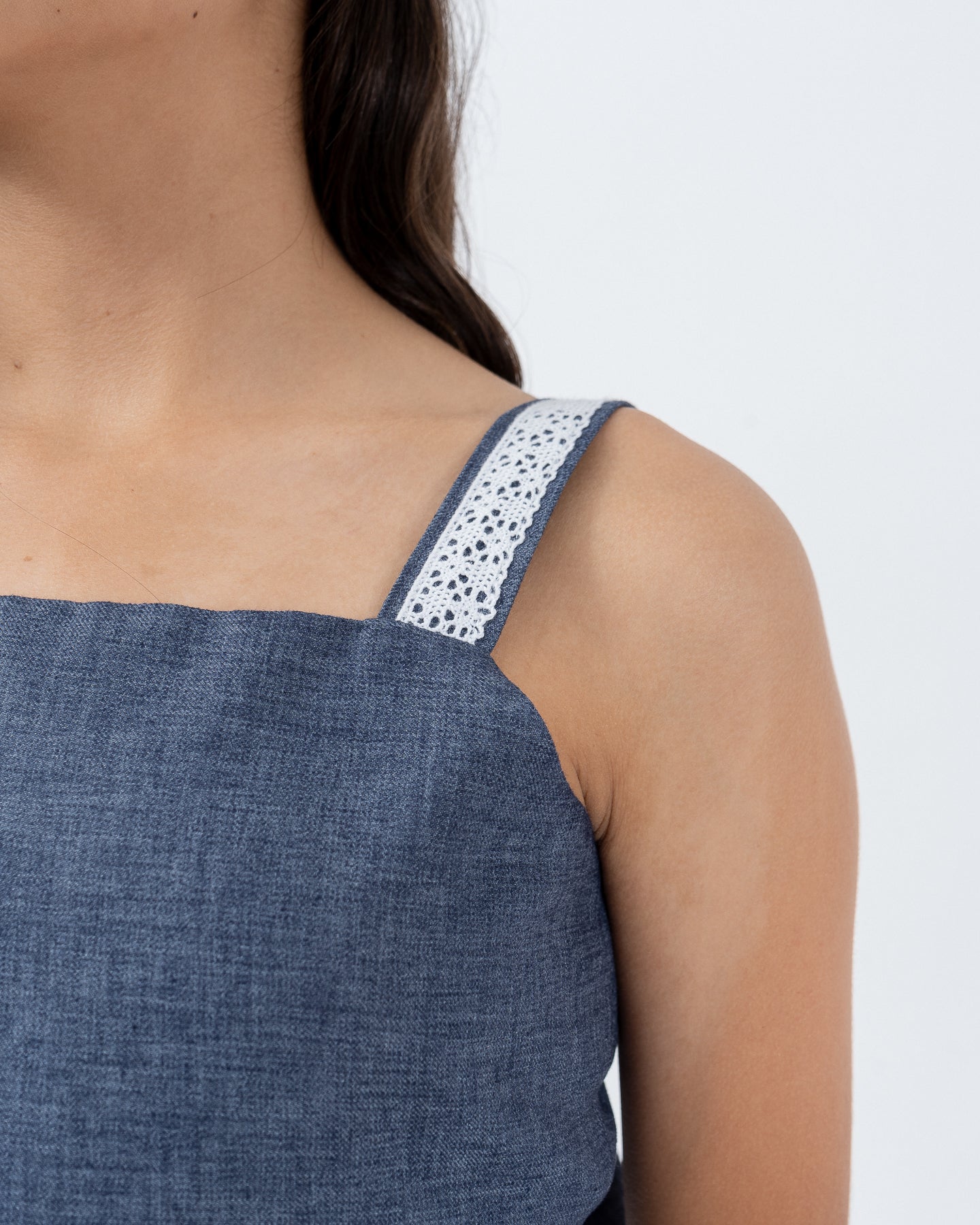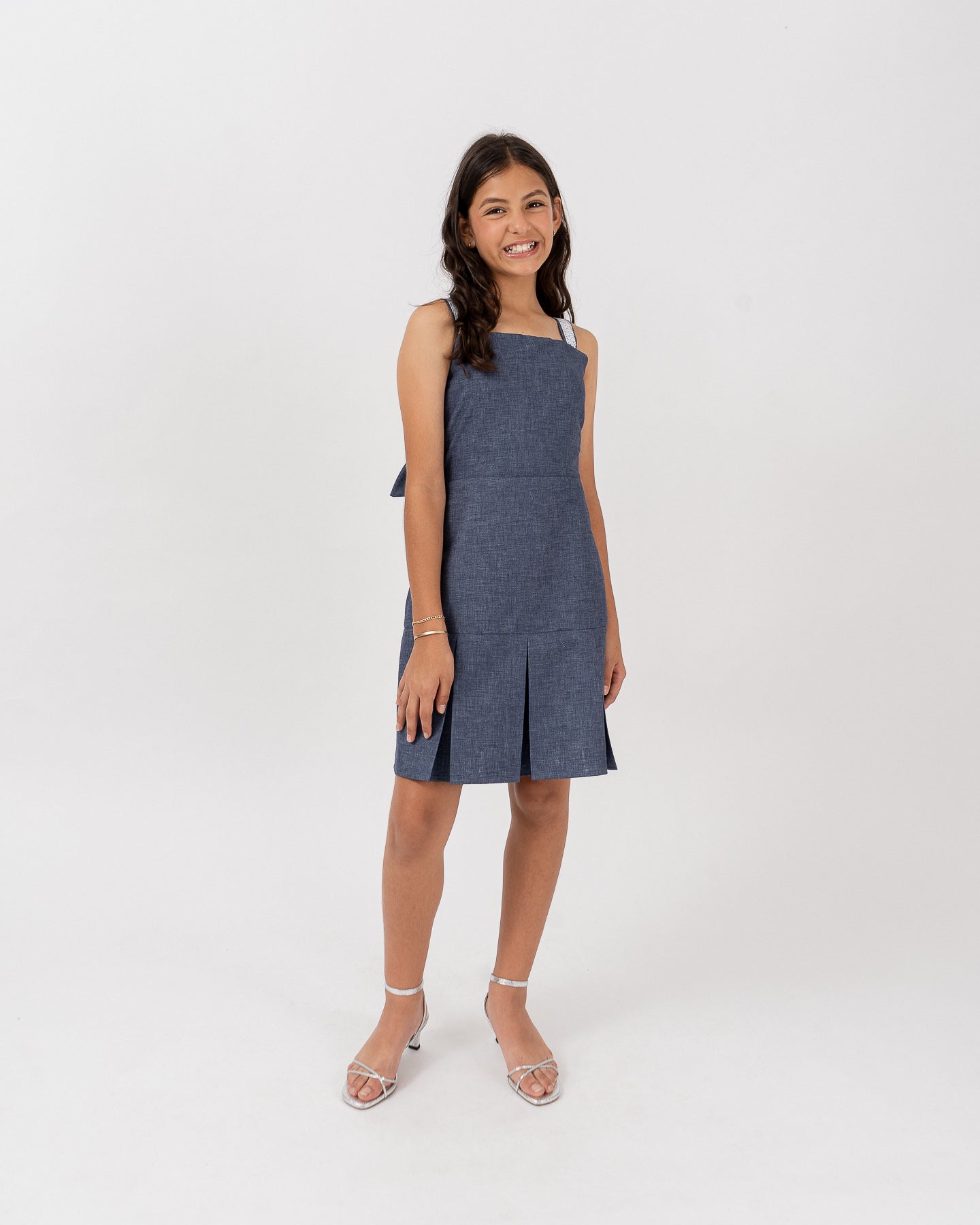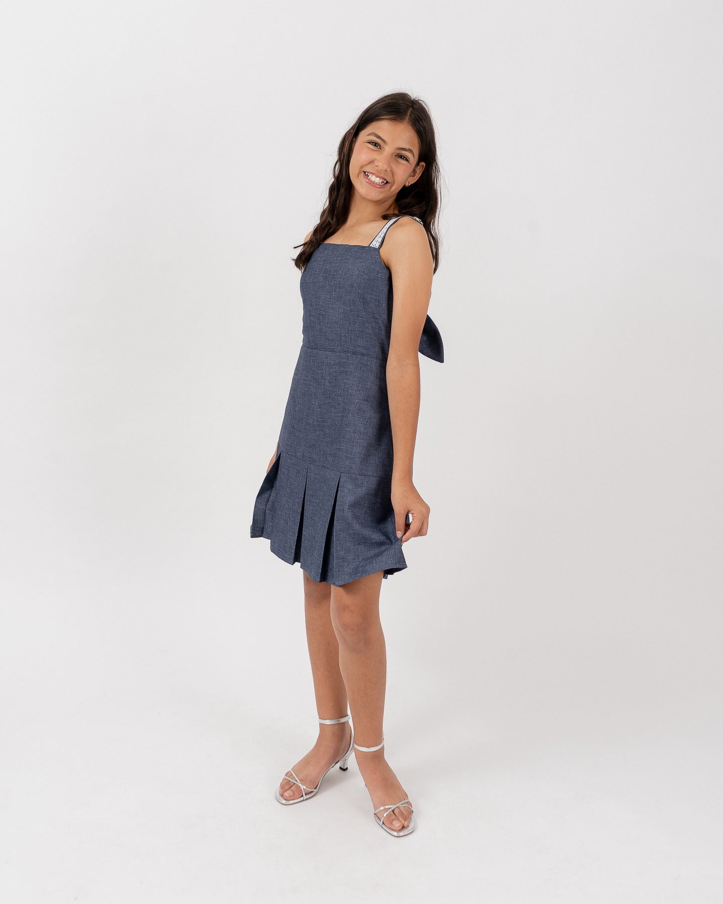 Vestido forrado con tirantes decorados con guipur. Espalda con lazo para ajustar amarre, ruedo con tablones en contorno.