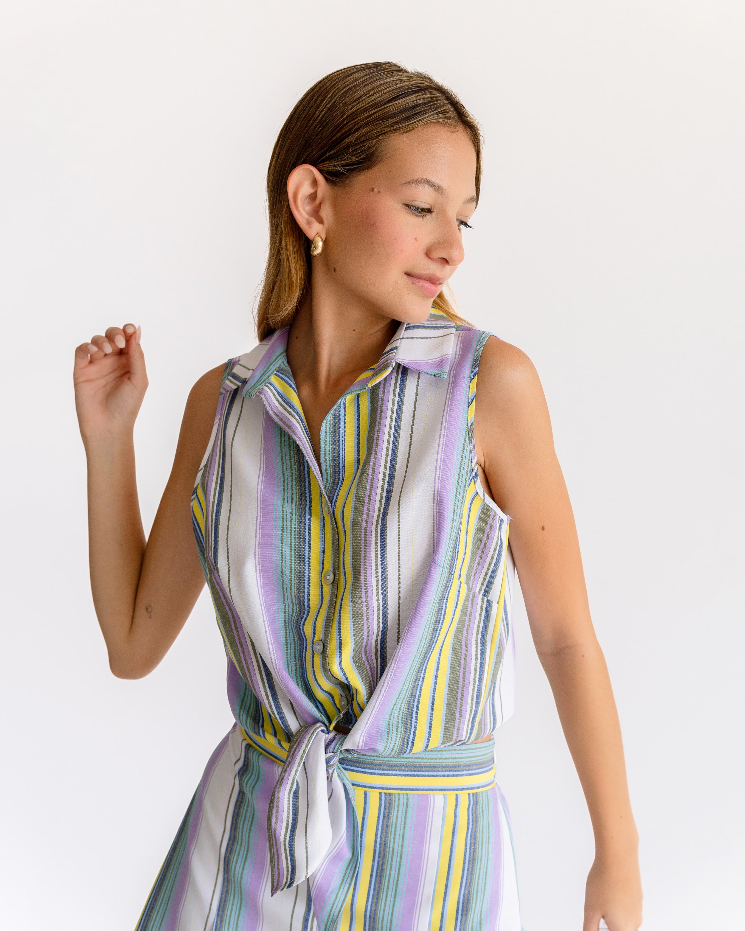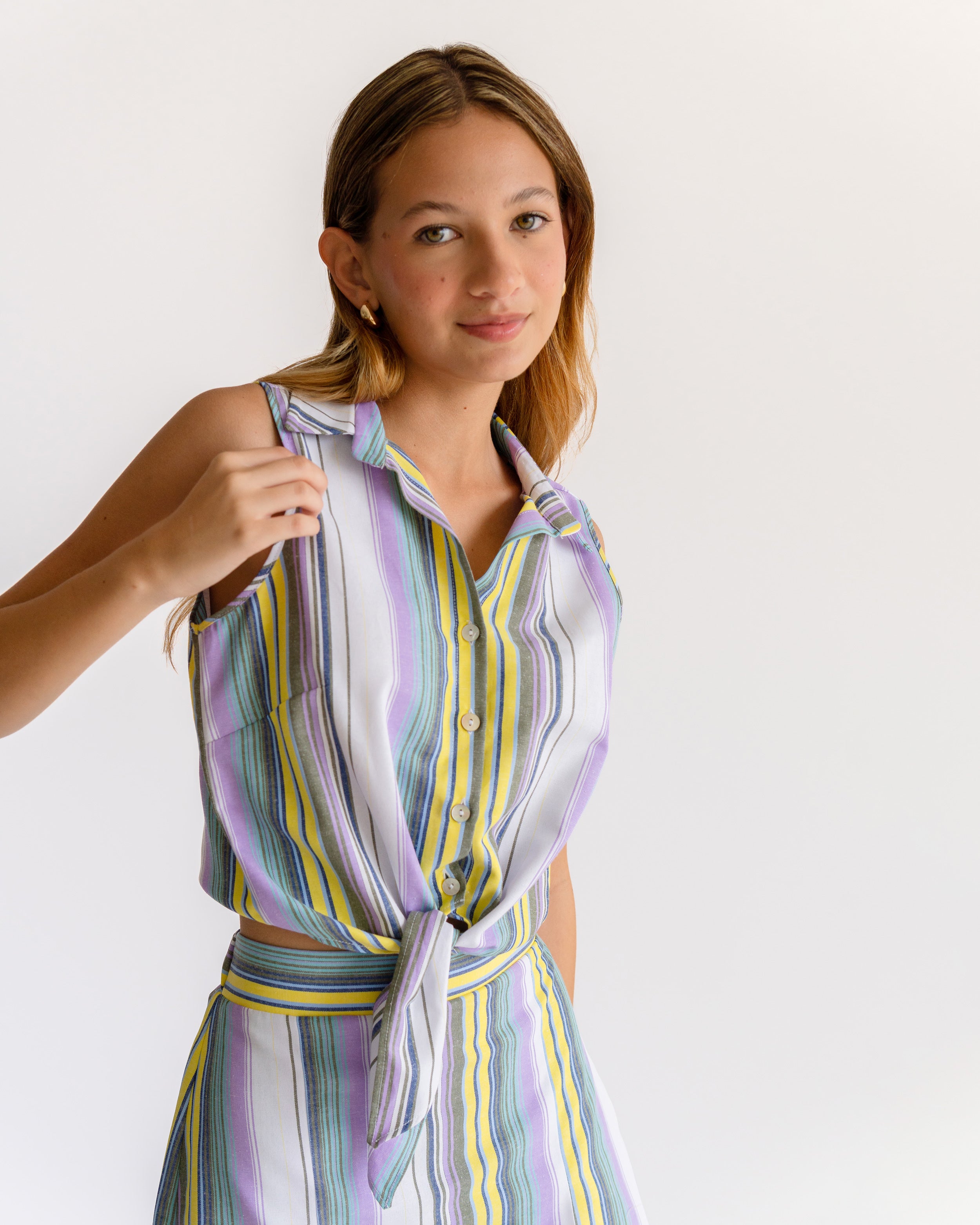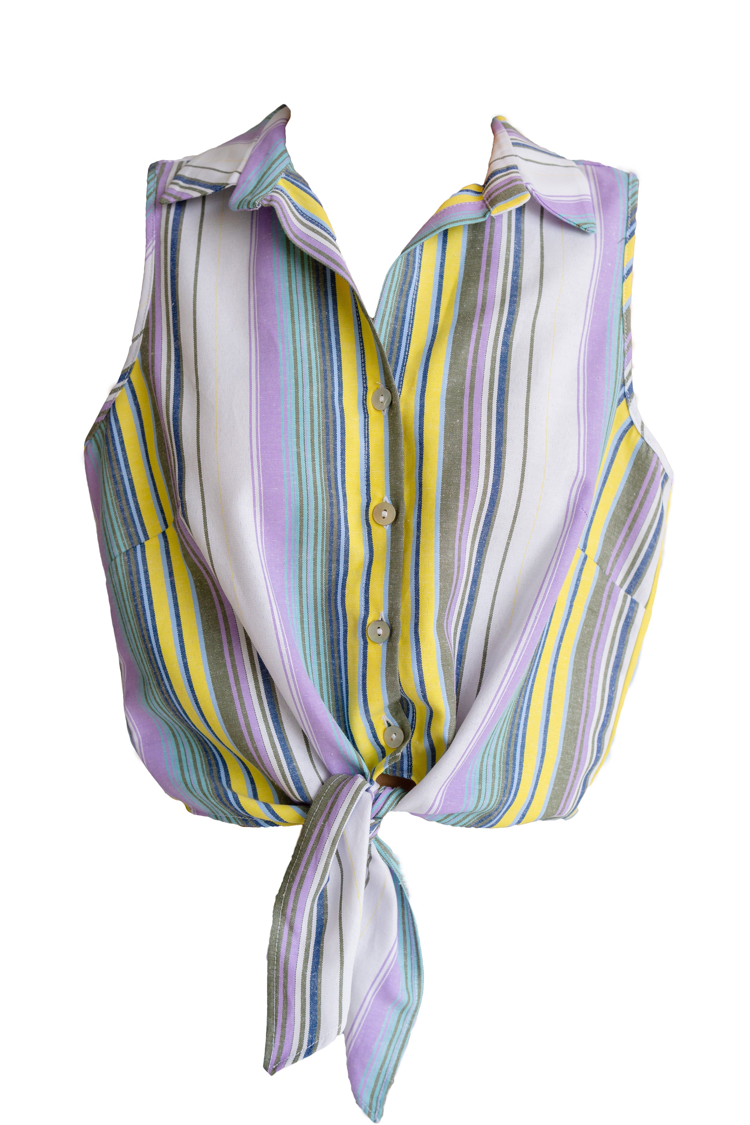 Blusa de rayas cuello camisero manga sisa con nudo inferior
