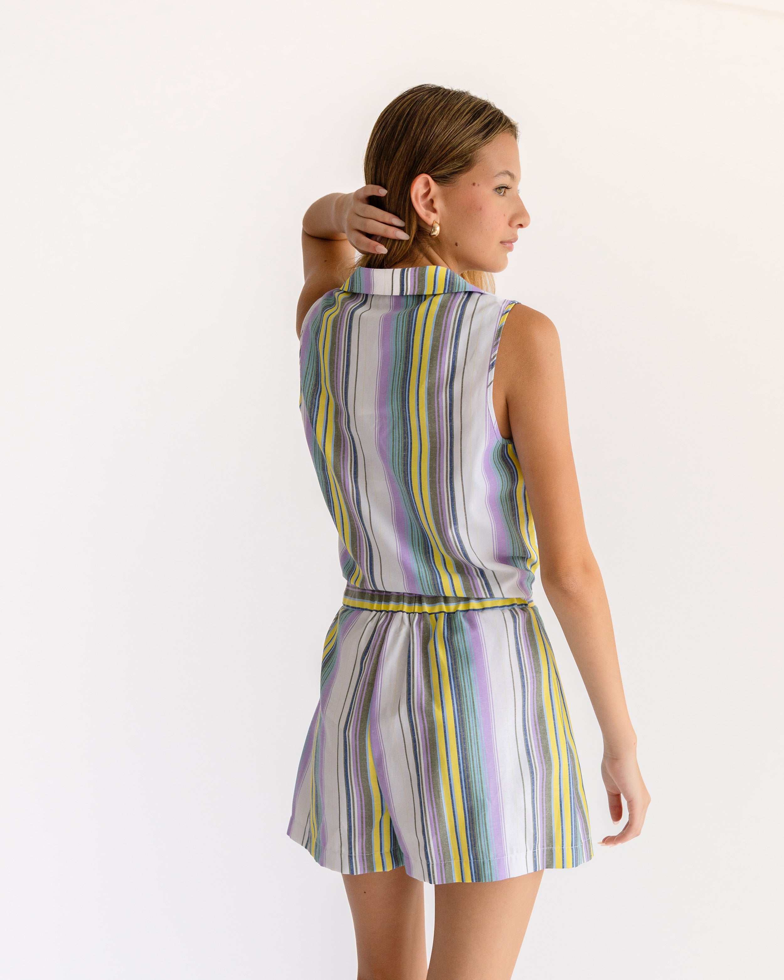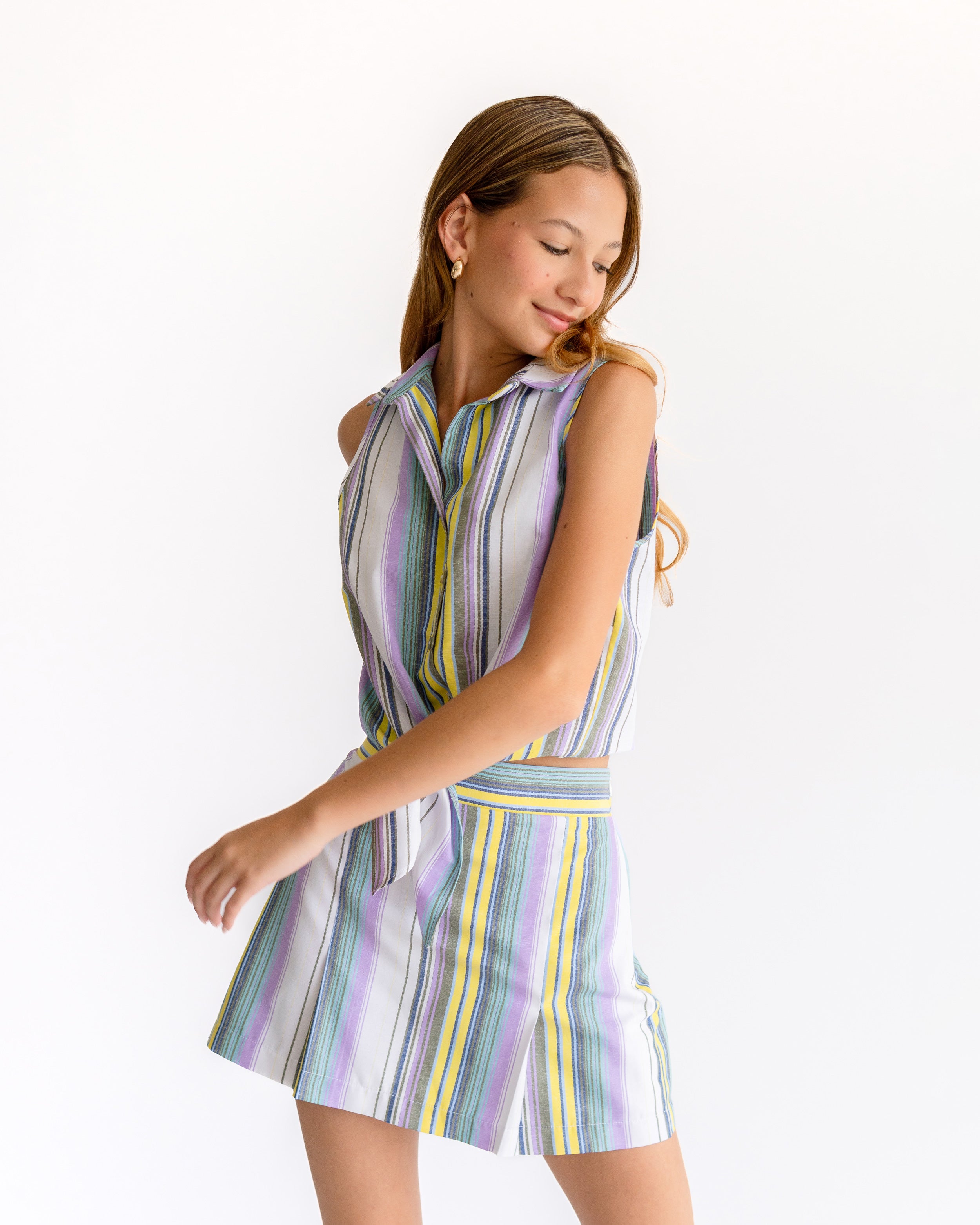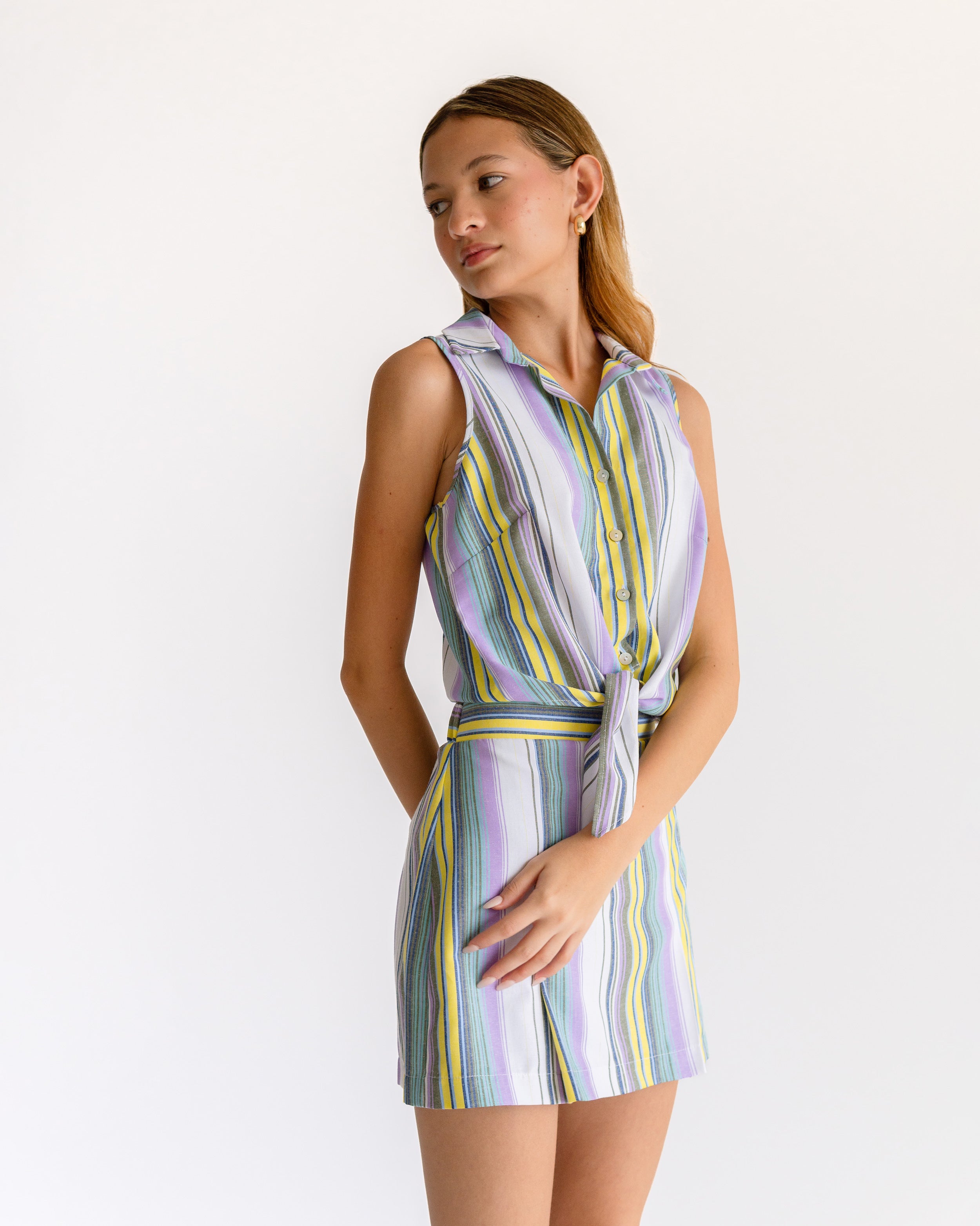 Blusa de rayas cuello camisero manga sisa con nudo inferior